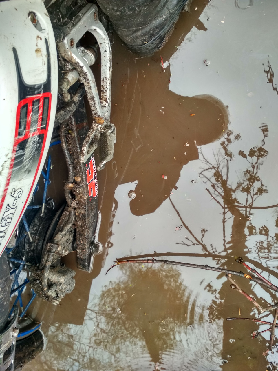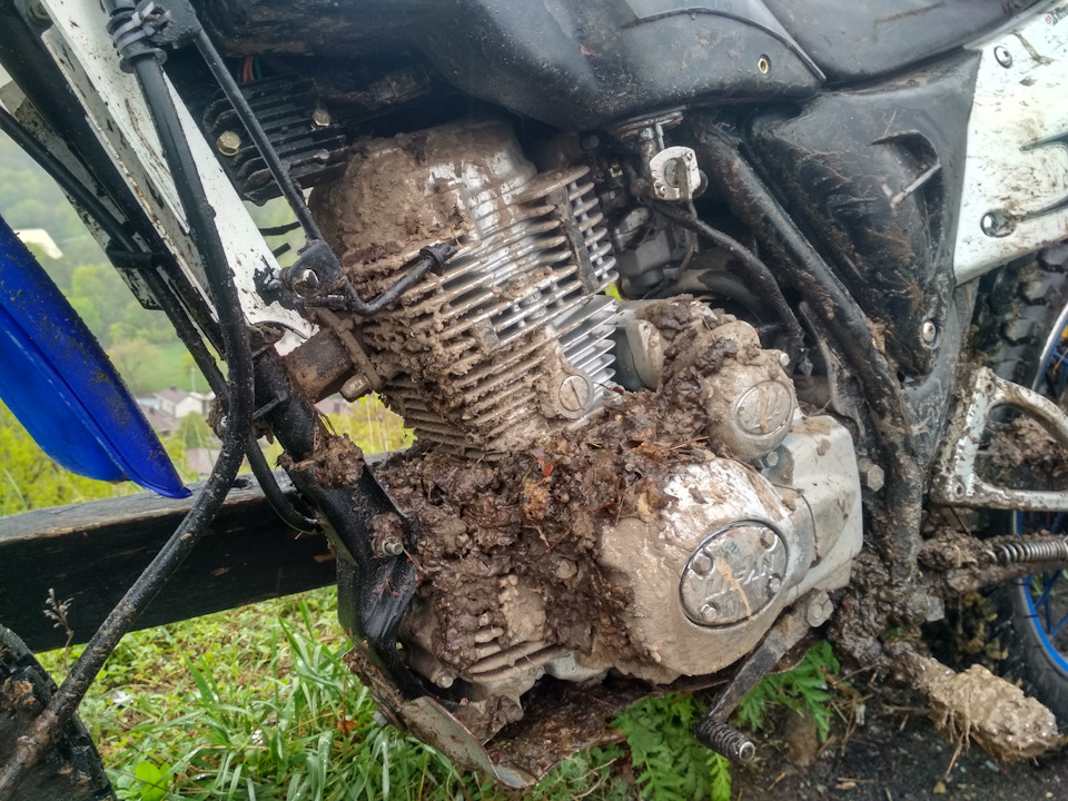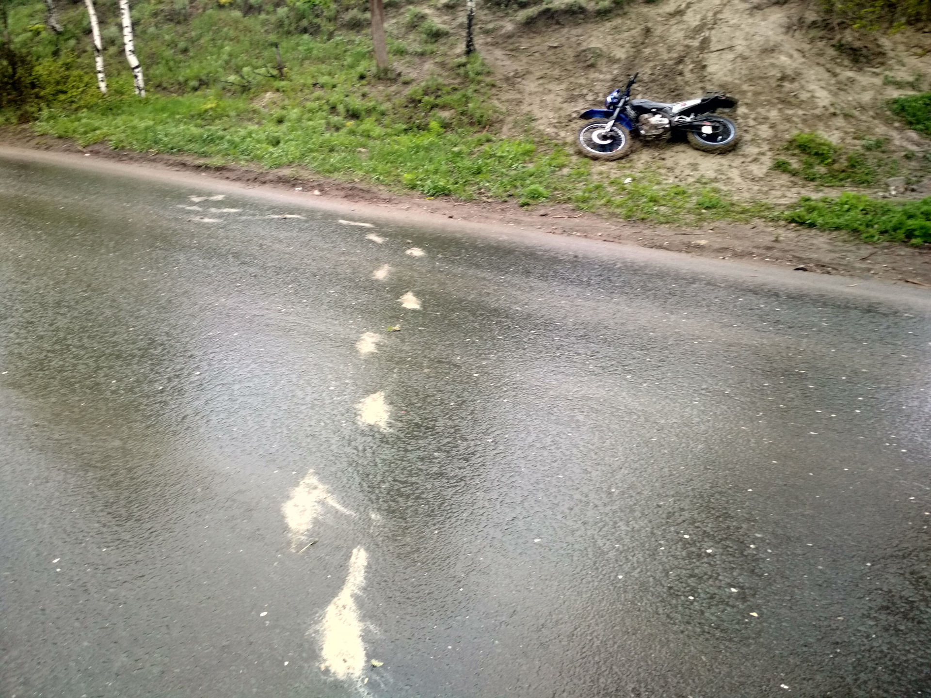 Ну что-ж, поднял мот и поехал на мойку. Пока резина была грязной — ногами скользил по асфальту, чтобы не упасть. За мной оставалось три грязных полосы на мокрой дороге…