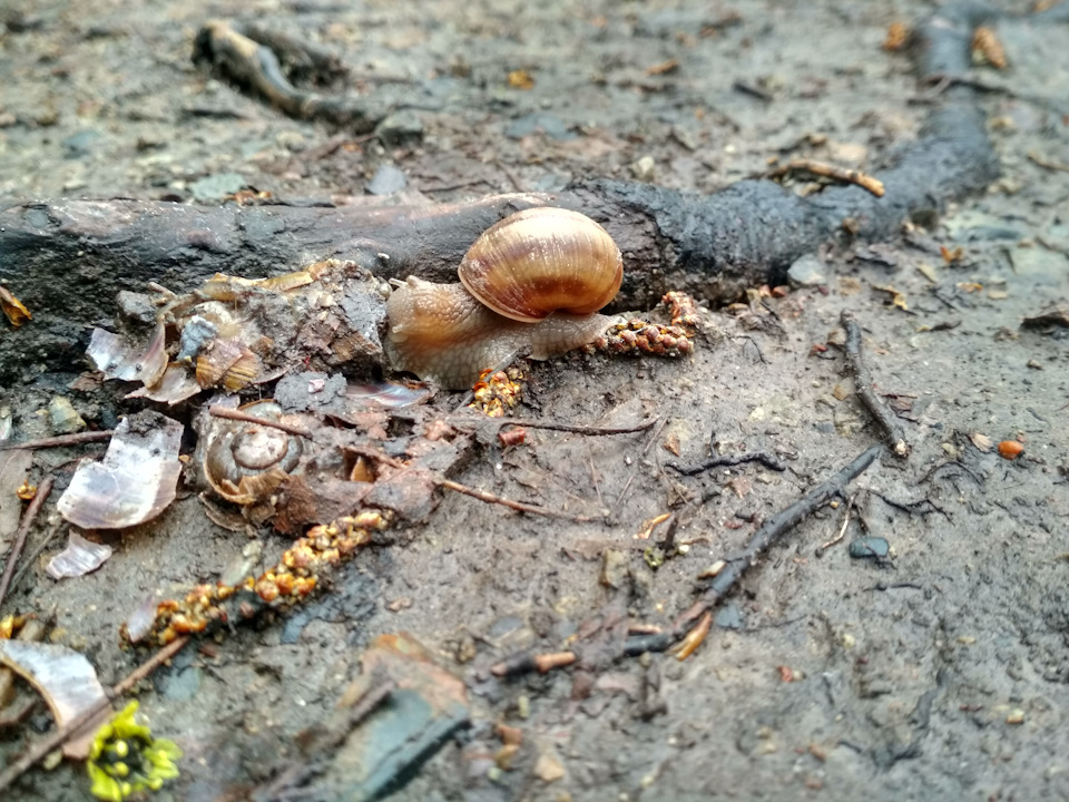 На дороге то и дело я видел улиток, одну даже перехал, да простит меня гринпис, но она не убедилась в безопасности перехода дороги! Попутно обнаружил, что гордое племя улиток не особо парится по усопшим собратьям, а деловито подъедает их: