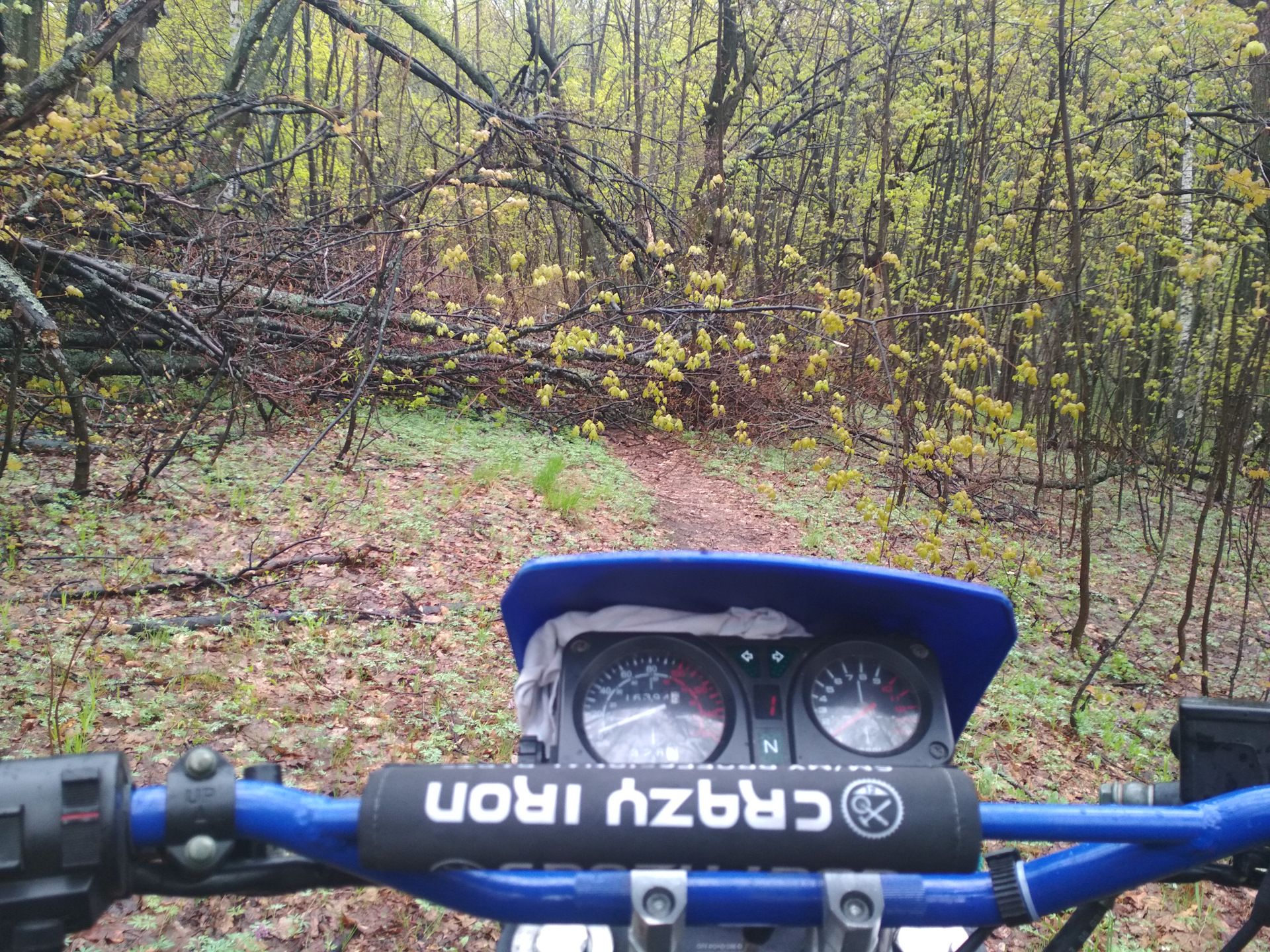 Сначала меня потащило в сторону тропинок над 6-й Дачной, ну, дескать, чуть-чуть катну по лесу и ладушки, но дальше понесло во все тяжкие. В лесу я свернул в сторону Кумысной поляны. К слову, я не особо люблю катать в лесу по Кумыске и подъездам к ней — люди ходят, велосипедисты ездят — я на мотоцикле, а значит — буду им мешать. Но тут был дождь. В лесу — никого! Красота! Поэтому с чистой совестью еду на Кумыску, минуя самые "попсовые" тропки, из-за чего часто натыкаюсь на поваленные деревья. Где получается переехать\перескочить через них, а где вот так: