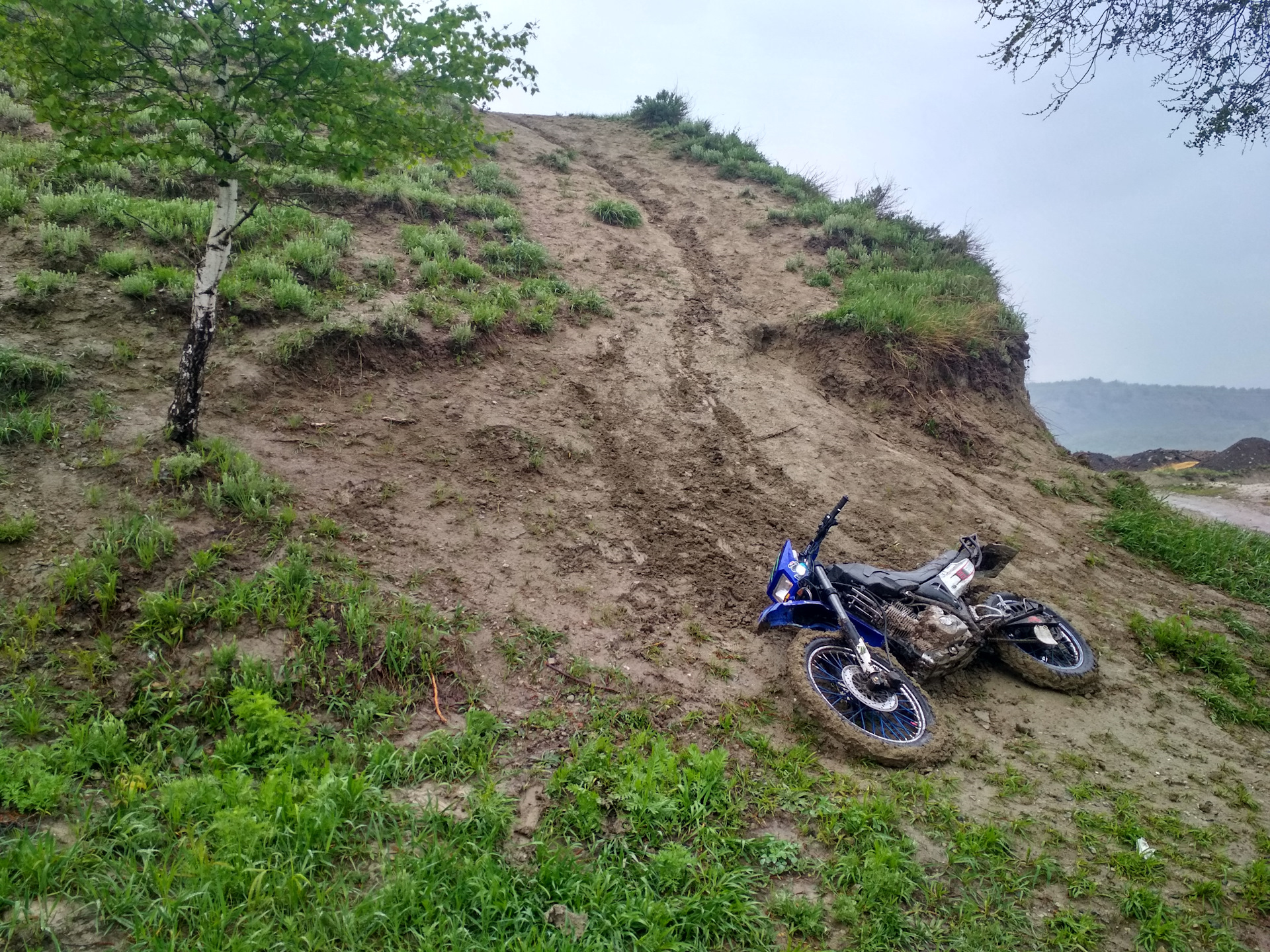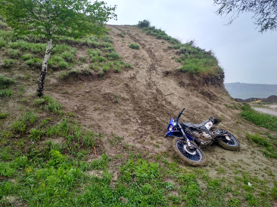 Тут я начал немного подмерзать и решил ехать домой, но спускался с холма не как обычно, а по короткой дороге к асфальту. Спуск оказался глинистым, колеса замылило и нос мота понесло. Опять уложил мот на бок))) В этот день он от души повалялся)