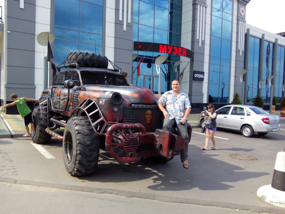 ЗиМ этот долгое время валялся на другой стороне дороги возле импровизированного автовокзальчика с ларьками, а лет 10 назад из него стали ваять эту высокохудожественную инсталляцию. Ещё там рядом была рукожопая мастерская, в которой самопровозглашённый автоэлектрик вызвался заменить мне щётки генератора Г108 на Москвиче408 в декабре 2005-го. Щётки в их же магазине были стартёрные, но их никто не обрабатывал, а просто засунул в шахты…Зарядный ток шёл ровно 10 км…Потом они зависли и до Краснодара я тошнил на полудохлой батарее… Но денег взяли. А всего лишь просил арендовать на 2 часа помещение.