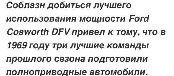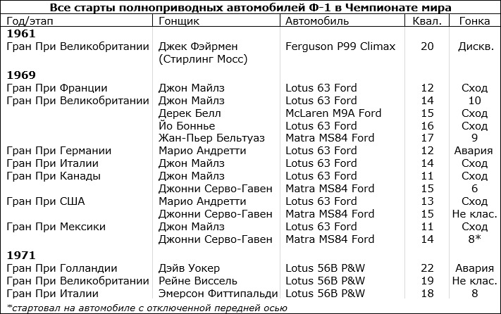 Соблазн добиться лучшего использования мощности Ford Cosworth DFV привел к тому, что в 1969 году три лучшие команды прошлого сезона подготовили полноприводные автомобили. Казалось, что в Формуле-1 происходит новая революция…