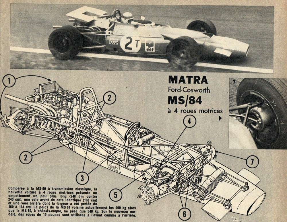 Дебют Lotus 63 был намечен на Гран При Голландии, где автомобиль команды Чэпмена оказался не одинок среди себе подобных. В Зандфорте появилась еще одна полноприводная машина – Matra MS84, так же оснащенная двигателем Cosworth. Сходу отличить MS84 от обычной заднеприводной MS80 можно было разве что по колесам одинакового размера на 15-дюймовых дисках (в Lotus использовали 13-дюймовые), хотя в основе болида для удобства обслуживания лежала пространственная рама, а не монокок. Главным конструктором MS84 был Бернар Бойер, а систему полного привода разрабатывал специалист Ferguson Дерек Гарднер. По компоновке Matra не отличалась от Lotus, только валы были проложены с правой стороны, а все дифференциалы производила фирма Ferguson. Кроме того во французской машине амортизаторы и пружины были размещены возле колес, а подвеска повторяла схему MS80 с двойными поперечными рычагами спереди и нижними поперечными и продольными сзади, хотя тормозные диски так же находились под обтекателем.