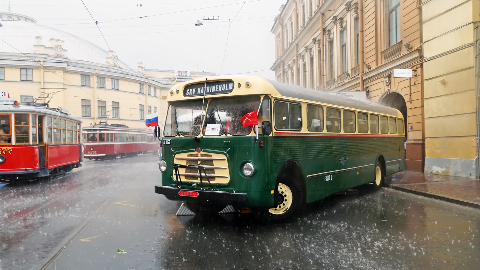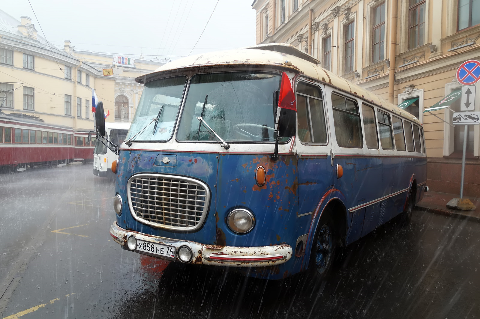 Уже во второй раз на параде светится эта Škoda 706RTO, купленная для коллекции RetroBus в Челябинской области. Шкода в прошлой жизни, как и большинство её "сестёр" в Союзе — бывшая медицинская спецмашина, работавшая в службе крови. Её выкладываю только ради эпичного фото с проливным ливнем, накрывшим центр Питера под вечер мероприятия))