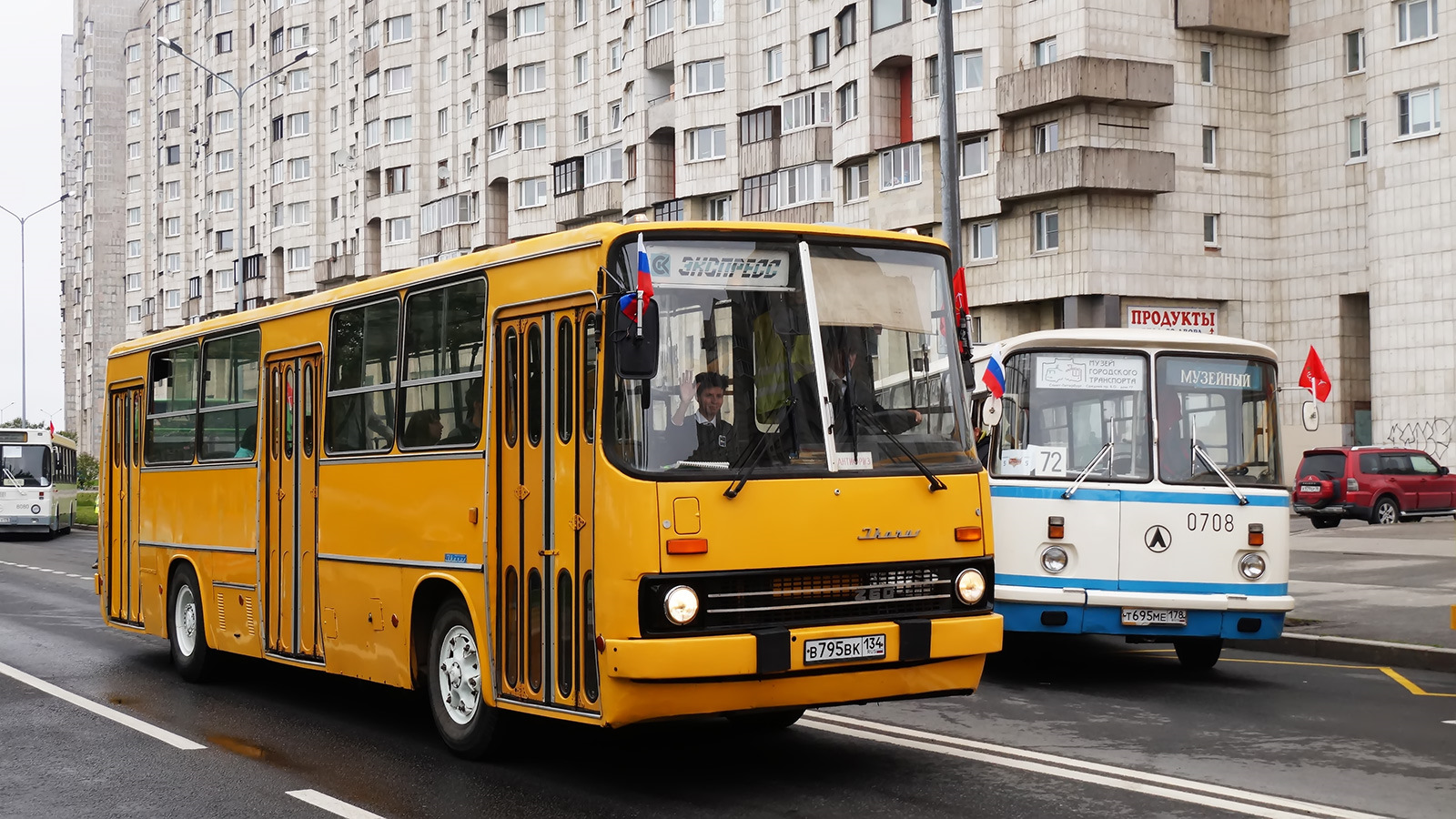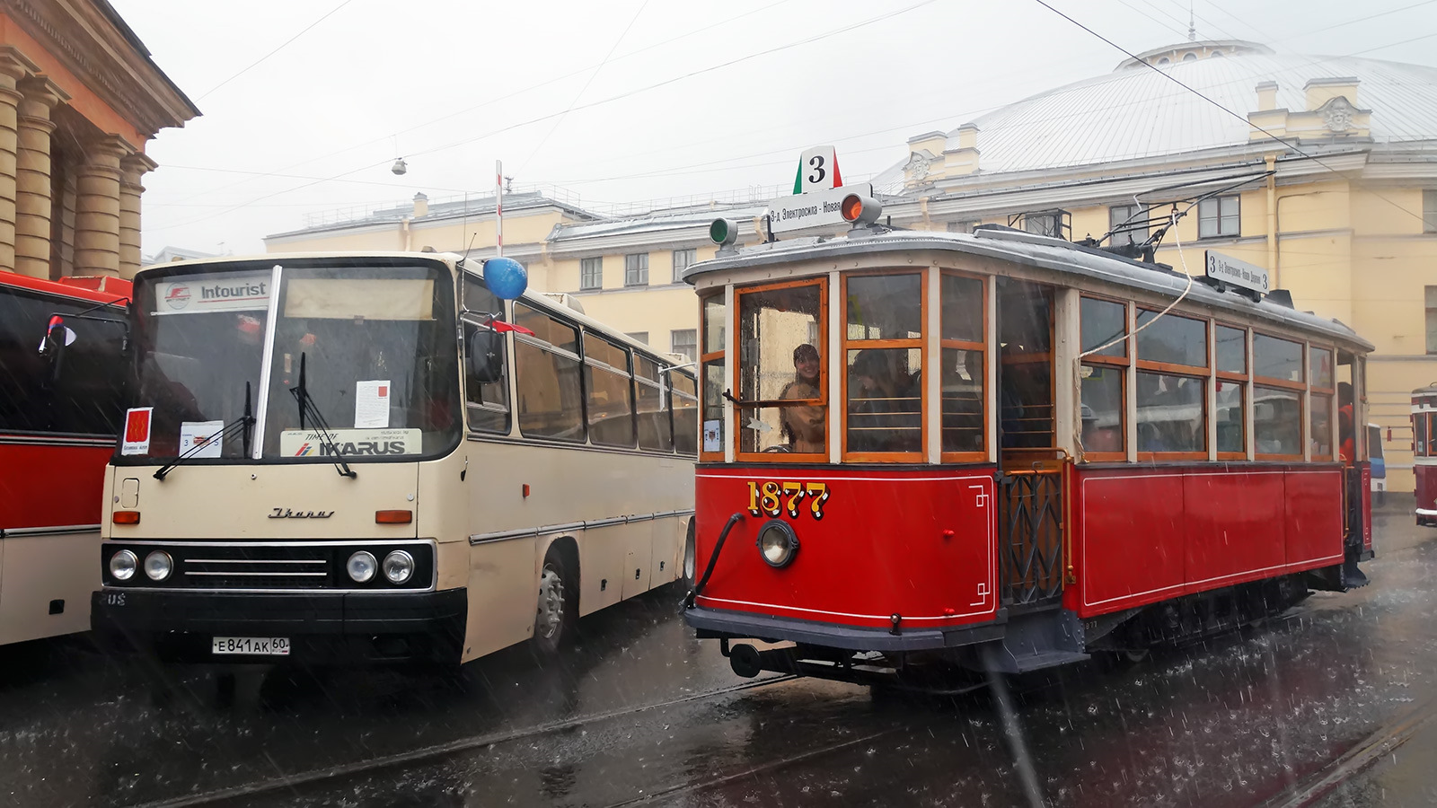Традиционно в параде принимают участие два его бессменных участника — "неразлучники" 677-е ЛиАЗы. Легендарный ЛиАЗ-677 "с автографом Боярского" из коллекции RetroBus, и его собрат из Колпинского автобусного парка "Пассажиравтотранса". Последний в Колпино был собран из кузова, работал на маршрутах, и в итоге — после снятия 677-х из эксплуатации его там восстановили как музейный экспонат.