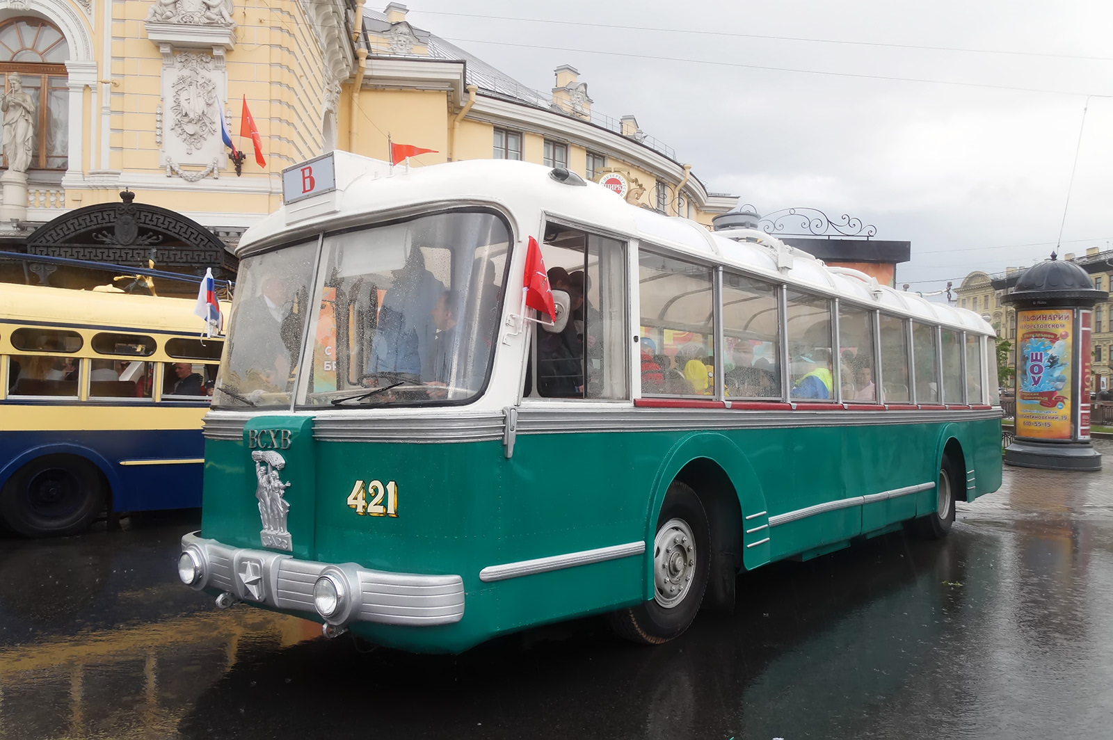 Четвёртым гостем парада из Москвы стал этот троллейбус СВАРЗ-ТБЭС. Он в Питере уже не в первый раз: дважды ТБЭС привозили на троллейбусные парады, организованные музеем "Горэлектротранса". Машину, ставшую в своё время символом ВДНХ — а значит, и Москвы — восстановили из сарая на родном СВАРЗе к 850-летию столицы, в 1997 году.