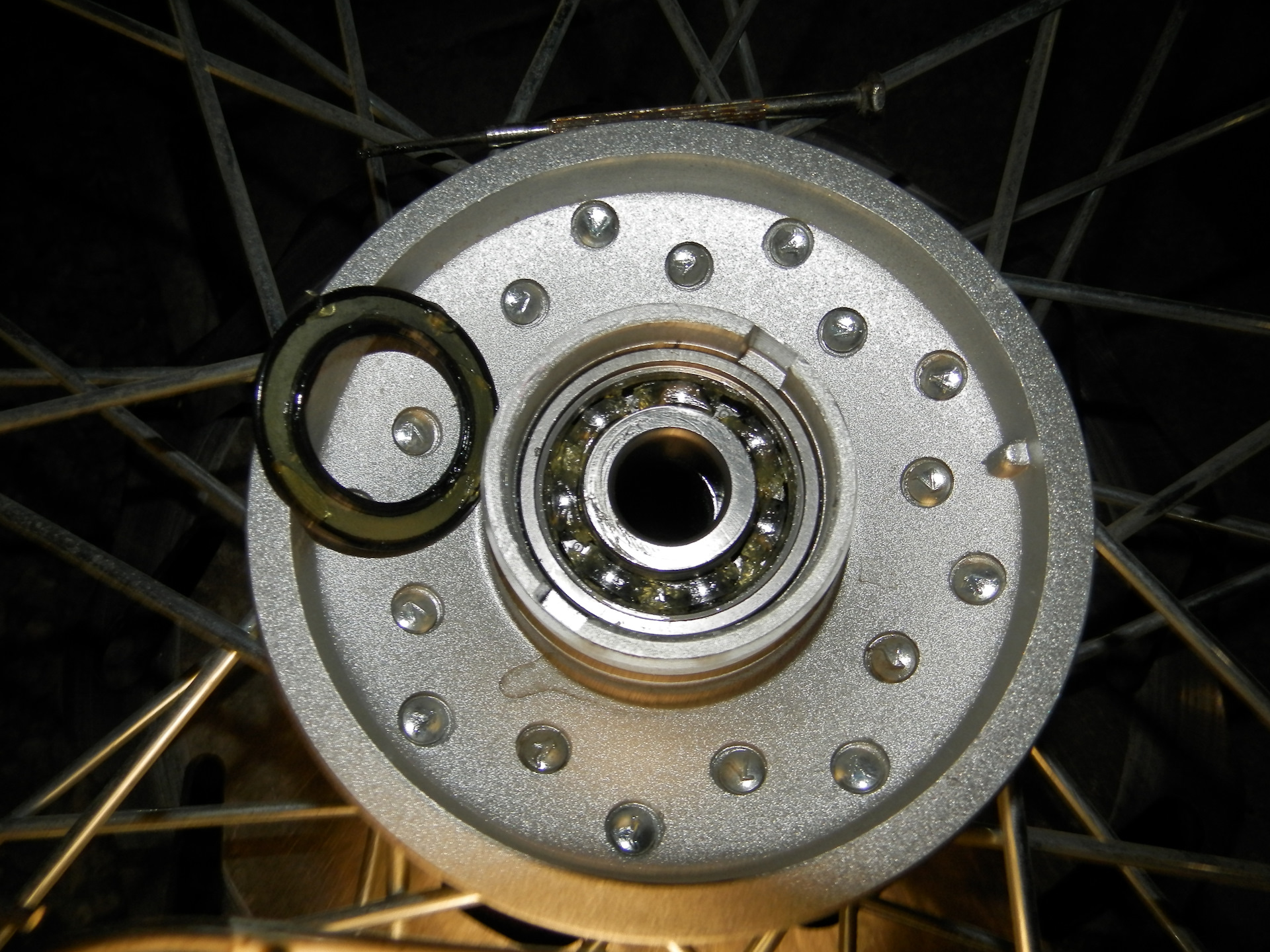 Далее колеса. Заднее колесо, спицы натянуты. А вот смазки минимум в подшипниках и один сальник криво забит и протерся насквозь. Сальник новый поставил, смазки водостойкой кучу, вроде нормально.