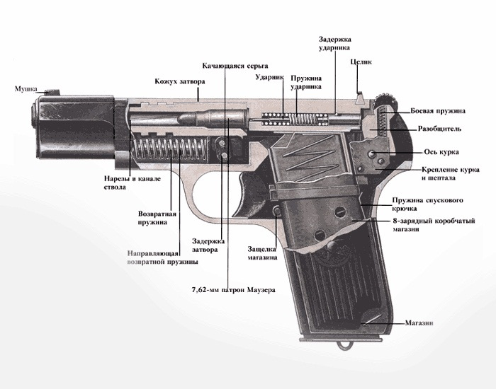 В пистолете Токарева сочетаются конструктивные особенности различных систем: схема запирания канала ствола конструкции Браунинга, примененная в знаменитом M1911, дизайн FN Browning model 1903 и патрон 7,63mm Mauser. В месте с тем пистолет имеет оригинальные конструктивные решения — объединение ударно-спускового механизма в отдельном едином блоке — колодке, который при разборке оружия свободно отделяется от рамы для чистки и смазки; размещение боевой пружины в курке, что сократило продольную ширину рукоятки; крепление щечек рукоятки при помощи закрепленных на них поворотных планок, упрощавших разборку пистолета, отсутствие предохранительного механизма, функцию которого выполнял только предохранительный взвод курка. Автоматика работает по схеме использования отдачи при коротком ходе ствола. Запирание осуществляется при помощи снижающегося ствола. Два боевых выступа, находящихся на внешней верхней стороне ствола перед патронником, входят в соответствующие пазы, выполненные во внутренней поверхности затвора-кожуха. Снижение казенной части ствола происходит по средством серьги, шарнирно соединенной со стволом осью серьги, а с рамой — осью затворной задержки. Ударно-спусковой механизм куркового типа, одинарного действия, с предохранительным взводом курка. При постановке курка на предохранительный взвод блокируется так же и затвор-кожух.