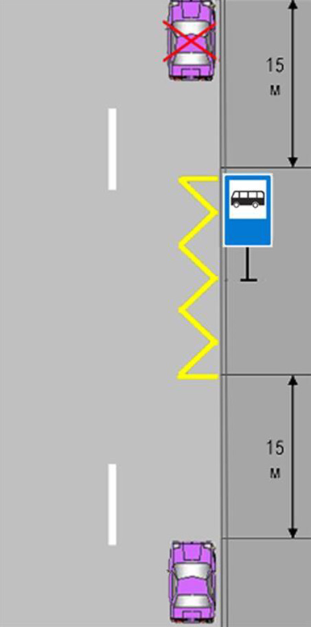 Рассмотрим ситуацию, — установлен знак, после него нанесено 15 м разметки. Это означает что нельзя парковать тс за 15 м до знака, и 30 метров после (15 м разметки и 15 м требования пдд). Делается это для того чтобы автобус 12-15 метров в длину смог подойти к краю тротуара и произвести высадку пассажиров. Стоит заметить что даже для 8 метрового двухосного автобуса отведенных 30 метров хватает для остановки у высокого бордюра впритык, так как занести свесы не всегда представляется возможным, и, ровно по этой причине на маршрутах где работаю удлиненные автобусы увеличивают протяженность остановки ОТ.