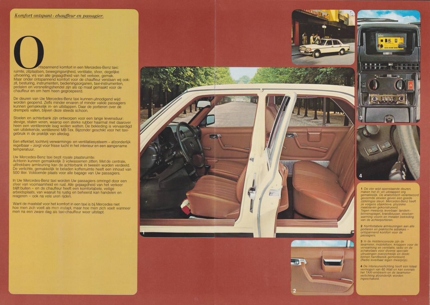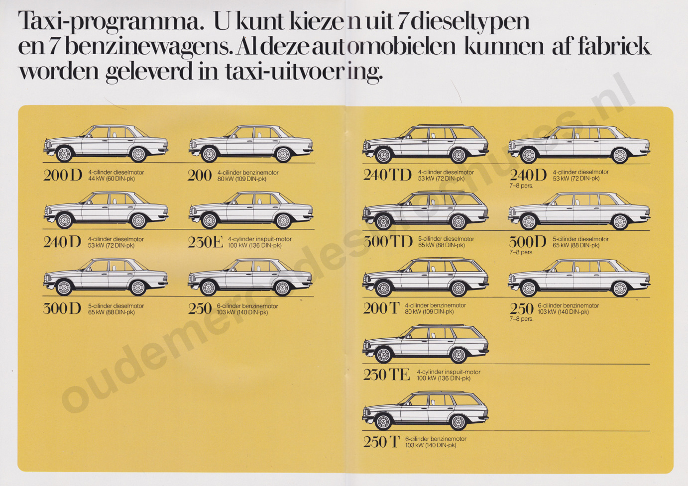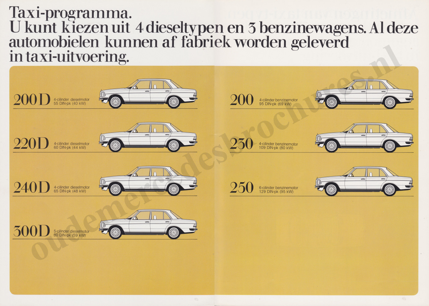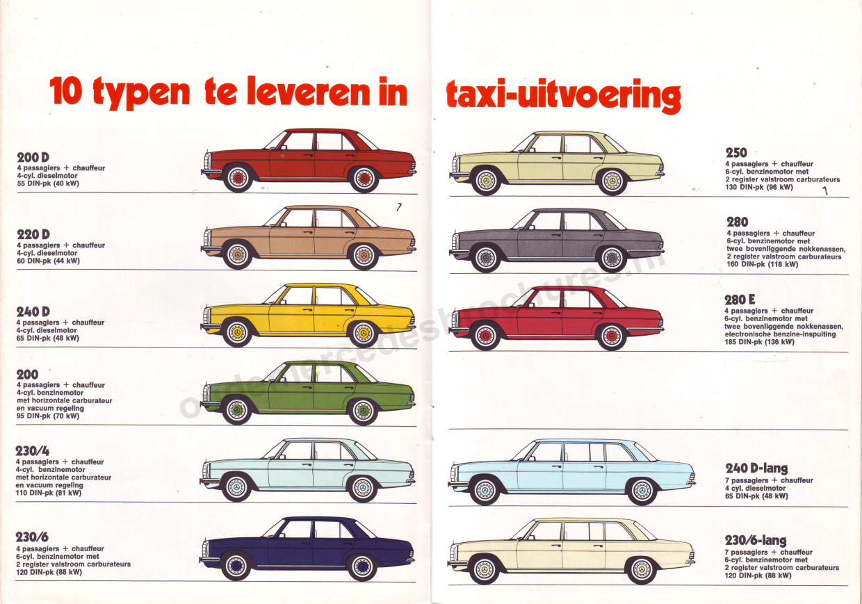 Что интересно, для работы в такси предлагался несколько ограниченный модельный ряд седанов, в отличие от предыдущей модели W114/W115.