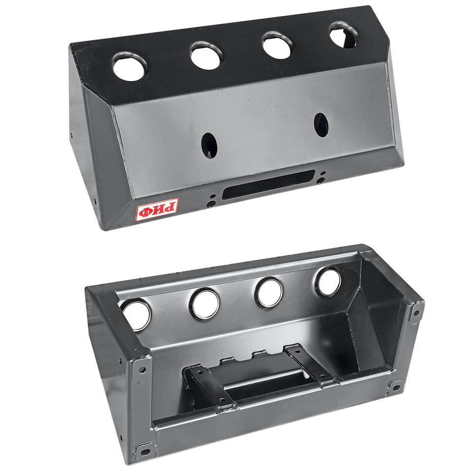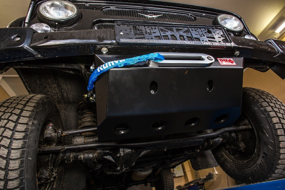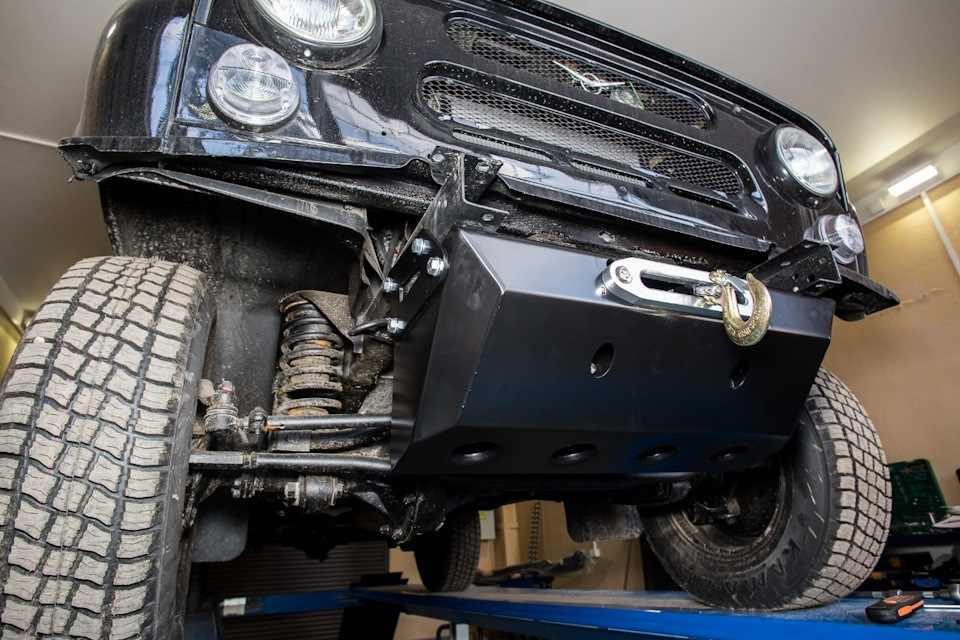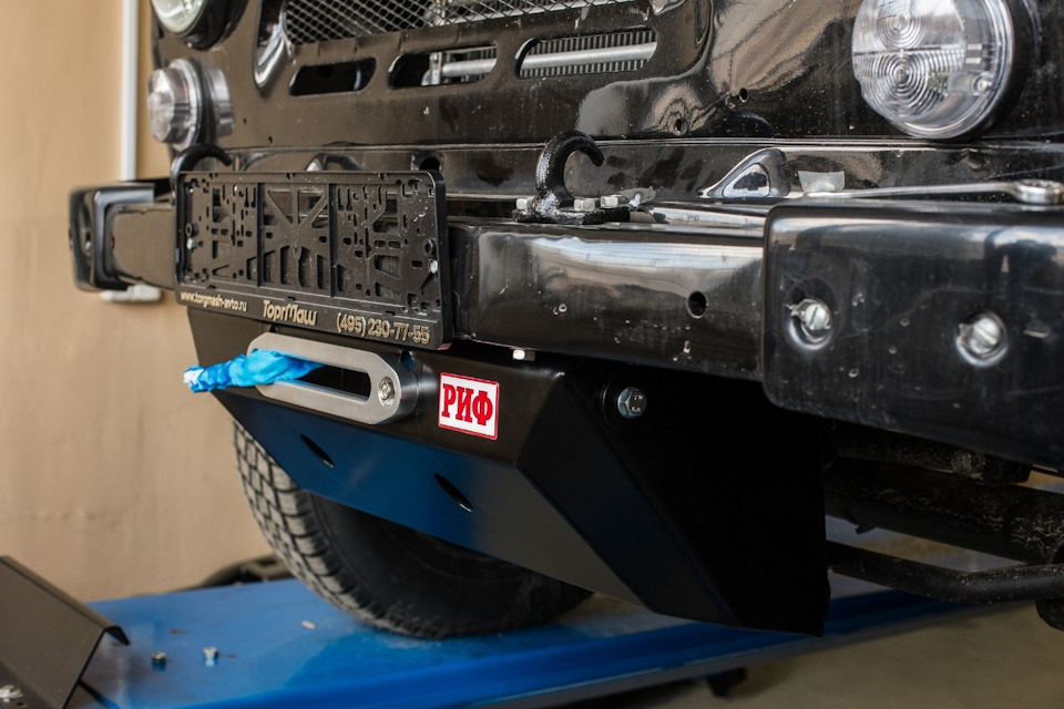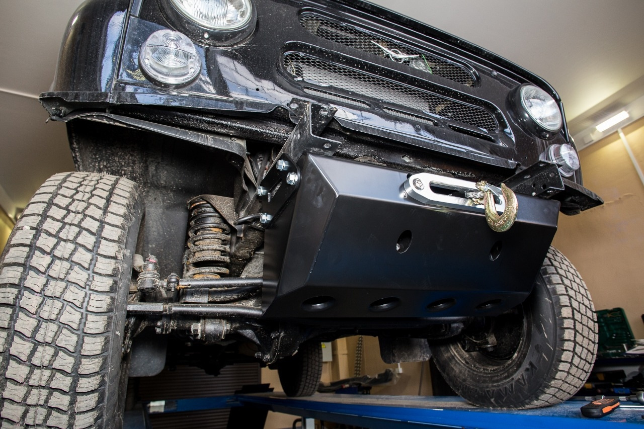 Универсальная конструкция, объединяющая в себе защиту рулевых тяг и площадку для скрытой установки электрической лебёдки, предназначена для установки на автомобиль УАЗ Хантер со штатным передним бампером. Данное изделие не привлекает излишнего внимания к себе и легко устанавливается. Прекрасно подойдёт для тех автовладельцев, которые не планируют серьезных конструктивных доработок с автомобилем, а просто хотят добавить уверенности в преодолении бездорожья.