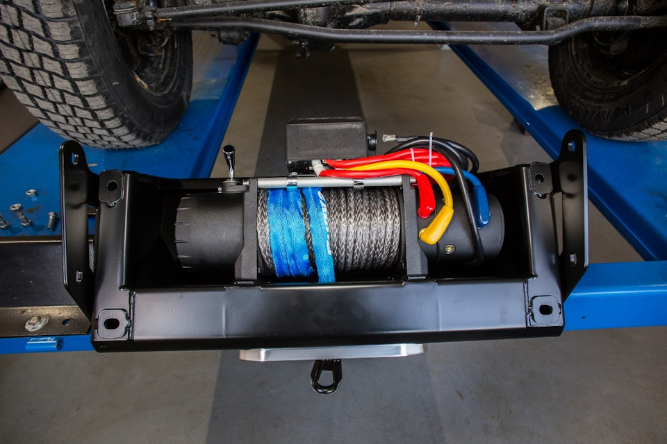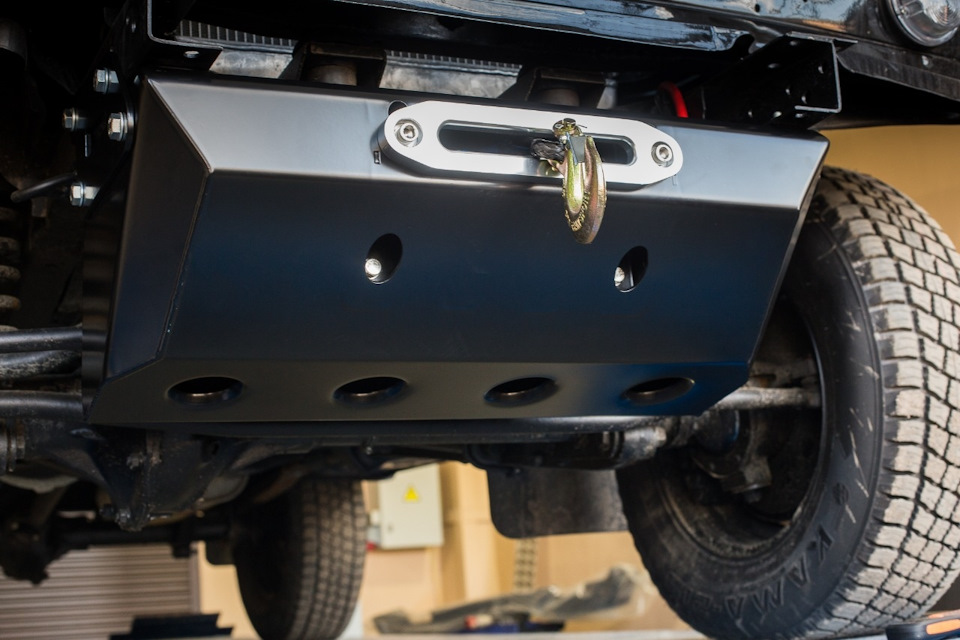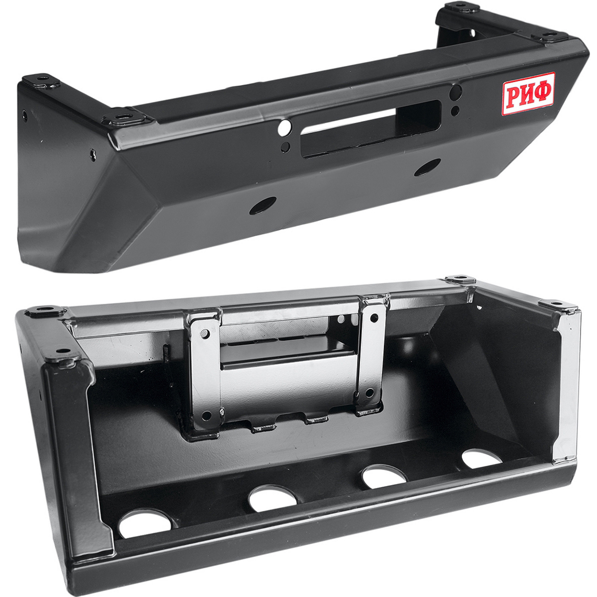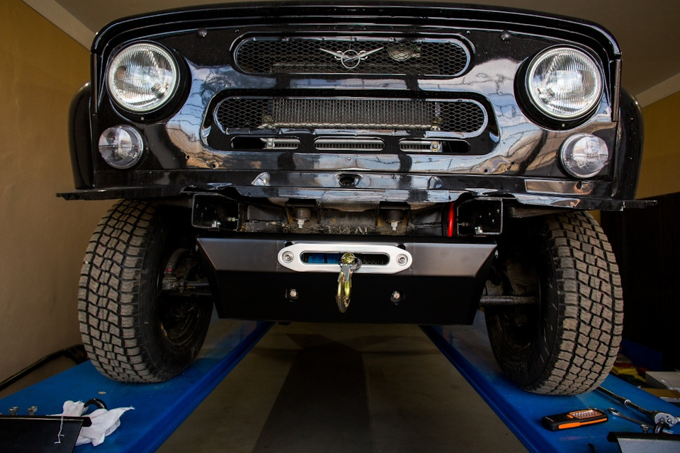 Универсальная конструкция, объединяющая в себе защиту рулевых тяг и площадку для скрытой установки электрической лебёдки, предназначена для установки на автомобиль УАЗ Хантер со штатным передним бампером. Данное изделие не привлекает излишнего внимания к себе и легко устанавливается. Прекрасно подойдёт для тех автовладельцев, которые не планируют серьезных конструктивных доработок с автомобилем, а просто хотят добавить уверенности в преодолении бездорожья.