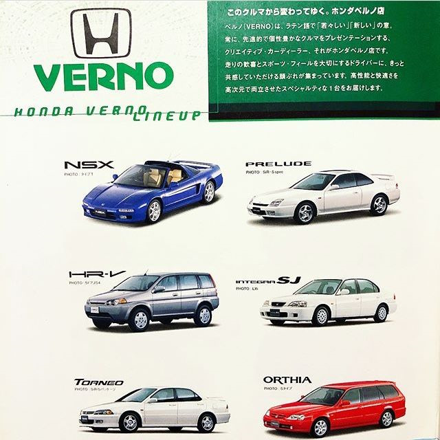 С момента своего создания дилерские центры Honda Verno начали продавать флагманский автомобиль Honda, SN Prelude, как выход на рынок спортивных автомобилей. Но как только появились новые модели, Honda обнаружила, что другие модели идеально подходят для изысканного выбора, и начала продавать другие модели под маркой Verno, включая модели CR-X и NSX. Следующие модели были проданы под именем Honda Verno: