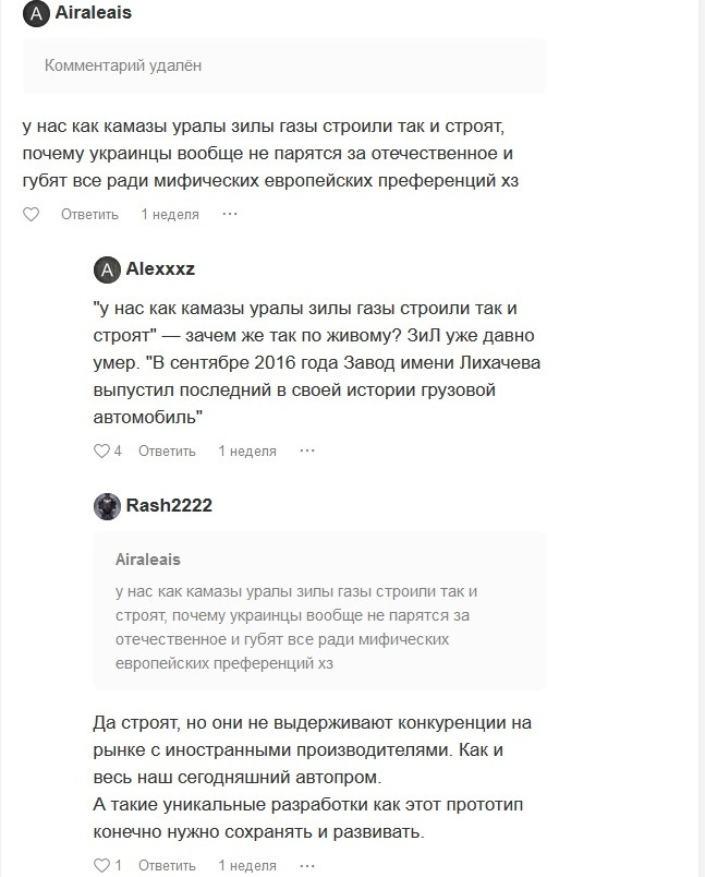 рынок не резиновый, в РФ есть ГАЗ, КАМАЗ и УРАЛ. все те клиенты что могли бы купить ЗИЛ купили КАМАЗ, таким образом благодаря альтернативным отечественным производителям и загнулся конкурент. Это здоровая рыночная история. Рынок в котором нет банкроств не здоровый, только в совке все тянули все и убыточное и прибольное. Во всем мире, от США до Австралии каждый день банкротятся фирмы, потому что это рынок. Потому просрали все относится только в том случае когда умирает единственный отечественный производитель, у которого не было отечественных конкурентов, который проиграл иномаркам ввозимым с пошлинами.(украинский сценарий) ЗИЛ проиграл, уралу с камазом, при этом ничего не просрали, камаз один сегодня занимает 41% российского рынка, из всего объема при этом гос заказ это 3-4% от всей произведенной продукции.