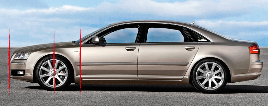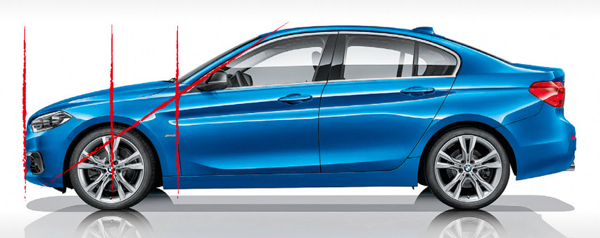 К уловкам и оптическим иллюзиям прибегают все. Вытянутой на боковину фарой можно укоротить свес, срубленным углом бампера и вертикальным ребром — ограничить длину крыла перед аркой, бликами или молдингами — нацелить стойку крыши и в ступицу, подштамповками вдоль порога — заузить боковины, а накладными арками — увеличить колеса.