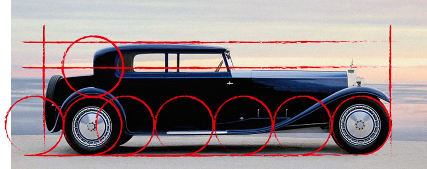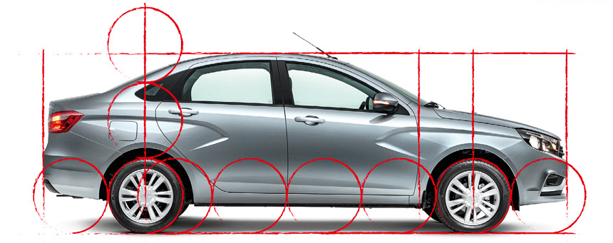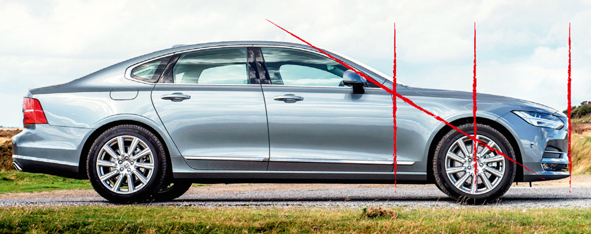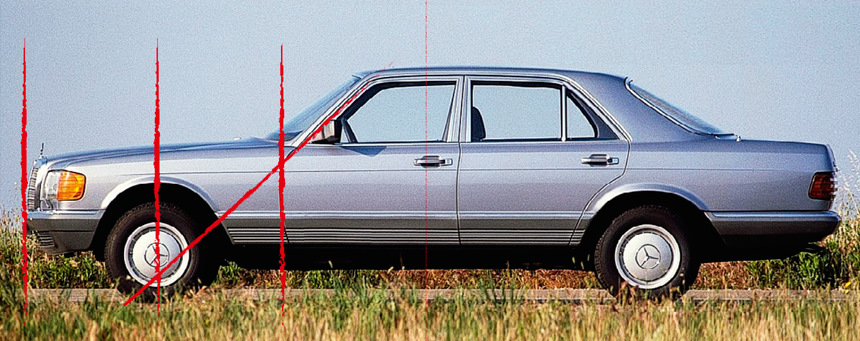 Здесь тоже нет строгой формулы, но есть принцип: чем длиннее, ниже и шире автомобиль, тем породистее и стремительнее он выглядит. Однако нельзя просто взять пластилиновый макет и потянуть его за бамперы: габариты должны оставаться в гармонии с размером колес и расстоянием между осями. Со времен довоенной классики в ходу негласный этикет: колесам следует отстоять друг от друга на 3,5—4,5 своего диаметра. Правда, от эпохи к эпохе эта норма плавала, особенно в 60-х и 70-х, когда размер колес уменьшился, поэтому, например, Mercedes W126, носивший максимум 15-дюймовые покрышки, мягко говоря, провалил бы такой фейс-контроль. Но сегодня все снова без ума от больших колес, и к правилу четырех диаметров вернулись почти все люксовые седаны.