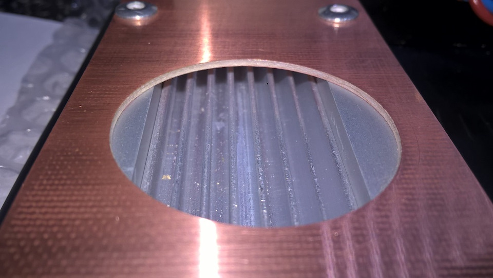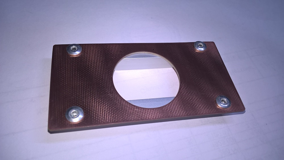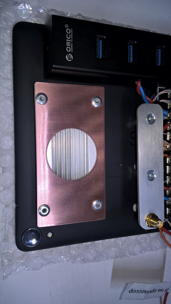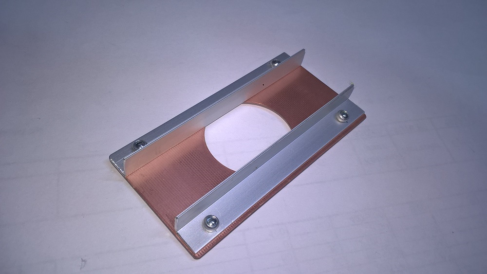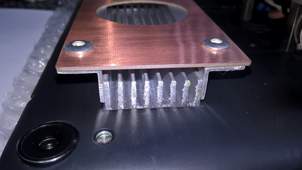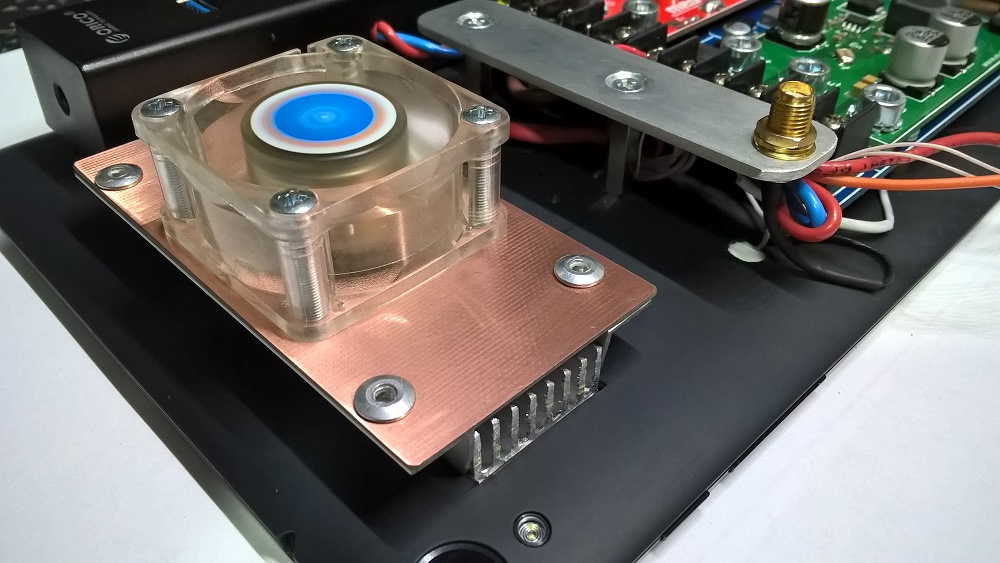 Радиатор низкопрофильный, ребристый, вытянутой формы, шириной 25 мм. Для лучшего обдува накрыл его крышкой из стеклотекстолита, поставив вентилятор 40 х 40 х 20 мм. Воздух подаётся на поверхность радиатора и выдувается с его торцов.