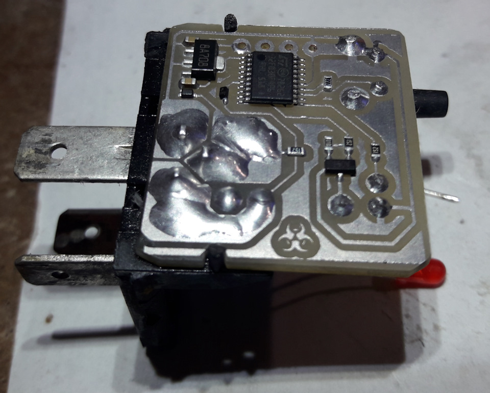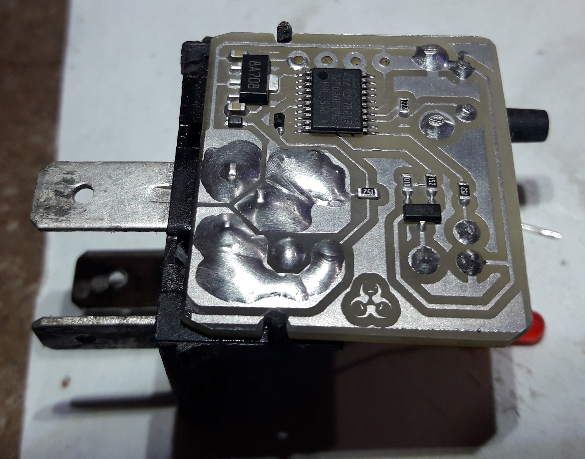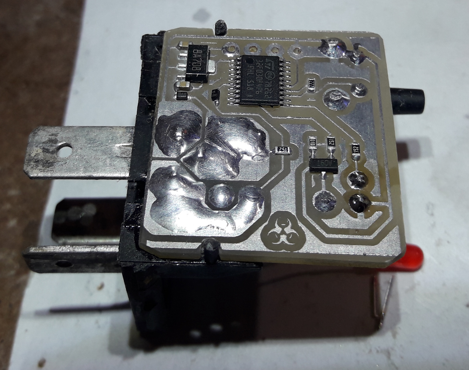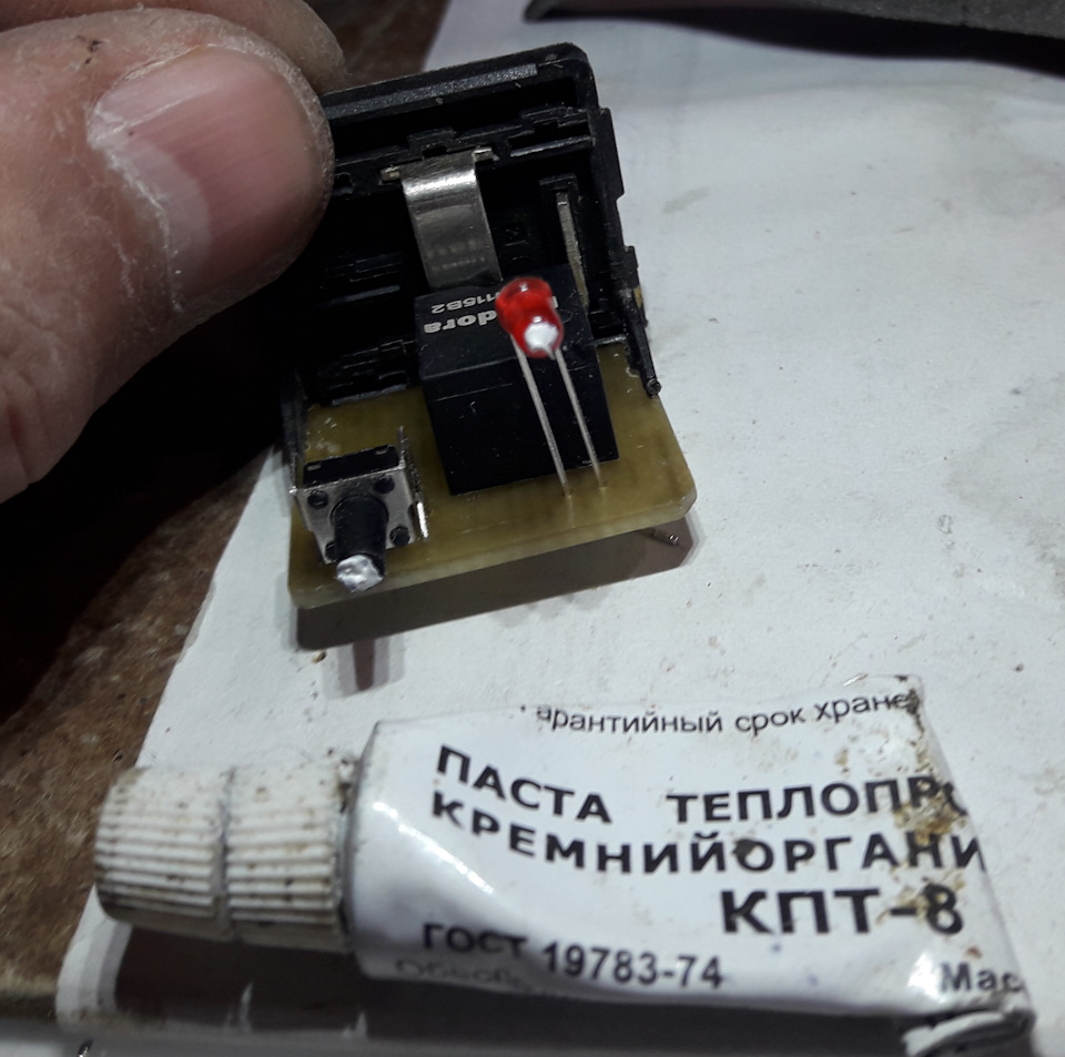 Приветы . В общем удовлетворяем людские хотелки . Задача — сделать реле поворотов для светодиодов . Как же всё просто на первый взгляд ))) На второй, всё сложнее чем кажется, хотя когда поглубже вникнешь, вроде и не так сложно . Сделал замеры, нарисовал, вытравил, отладил ( не сразу 😎 ) . Как сделать отверстия в корпусе точно ? Оказывается для этого есть специальная паста под названием КПТ8 ! Намазюкал на светик и кнопу пасты и притулил . Отпечатки показали где надо ковырять ))) К стати эту пасту незаслуженно хаят, она например незаменима если надо прочесть название какой нить микры . Работает как проявитель ! Намазал, стёр и она осталась только в надписи . Контраст на высоте, читабельность 100% . Если в цепи поворотников не будет резистивной нагрузки, будь то резистор на 1к или лампы накаливания, в повторителе например или в приборке, то светодиоды будут тлеть в момент паузы работы реле . В самом реле это не реализуемо . На фотках схема не правильная, в архиве все норм .