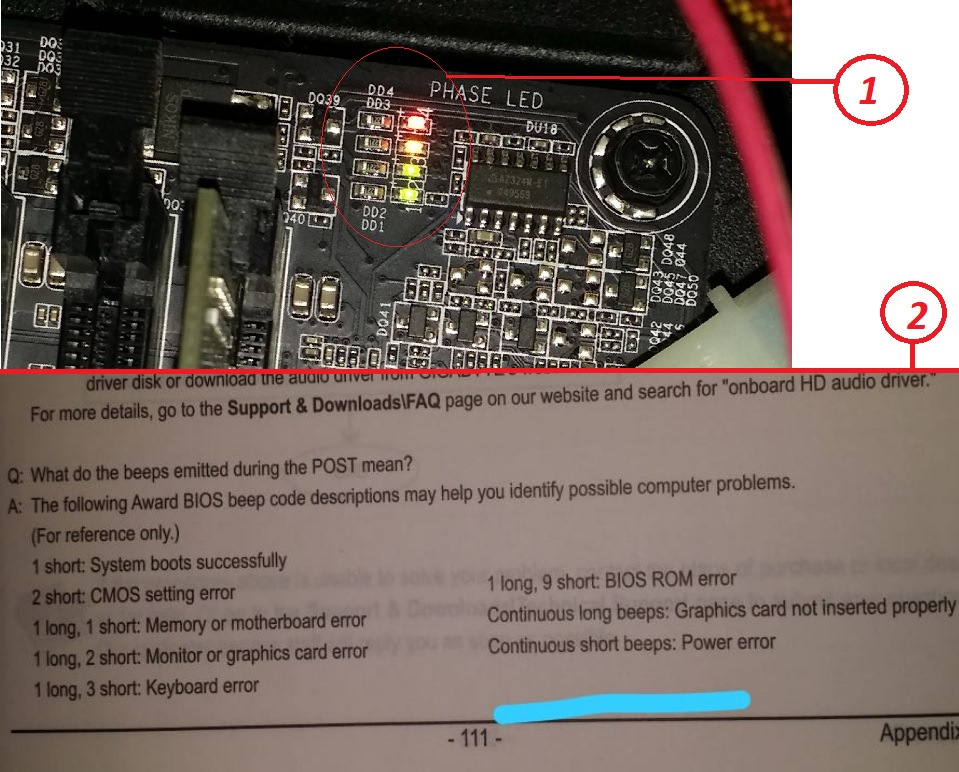 Когда были BSOD и перезагрузки со звуковыми сигналами, я обзвонил многих знакомых специалистов. Одни говорили, что проблема скорее всего в памяти ОЗУ, нужно перевтыкать их. Другие просили смотреть расшифровку сигналов в мануале. Я тоже думал что ОЗУ. Потому что у соседа было похожее (но без сигналов) — ему помогла замена планки ОЗУ. Ещё смутили эти огоньки на МВ . Фото 1.
