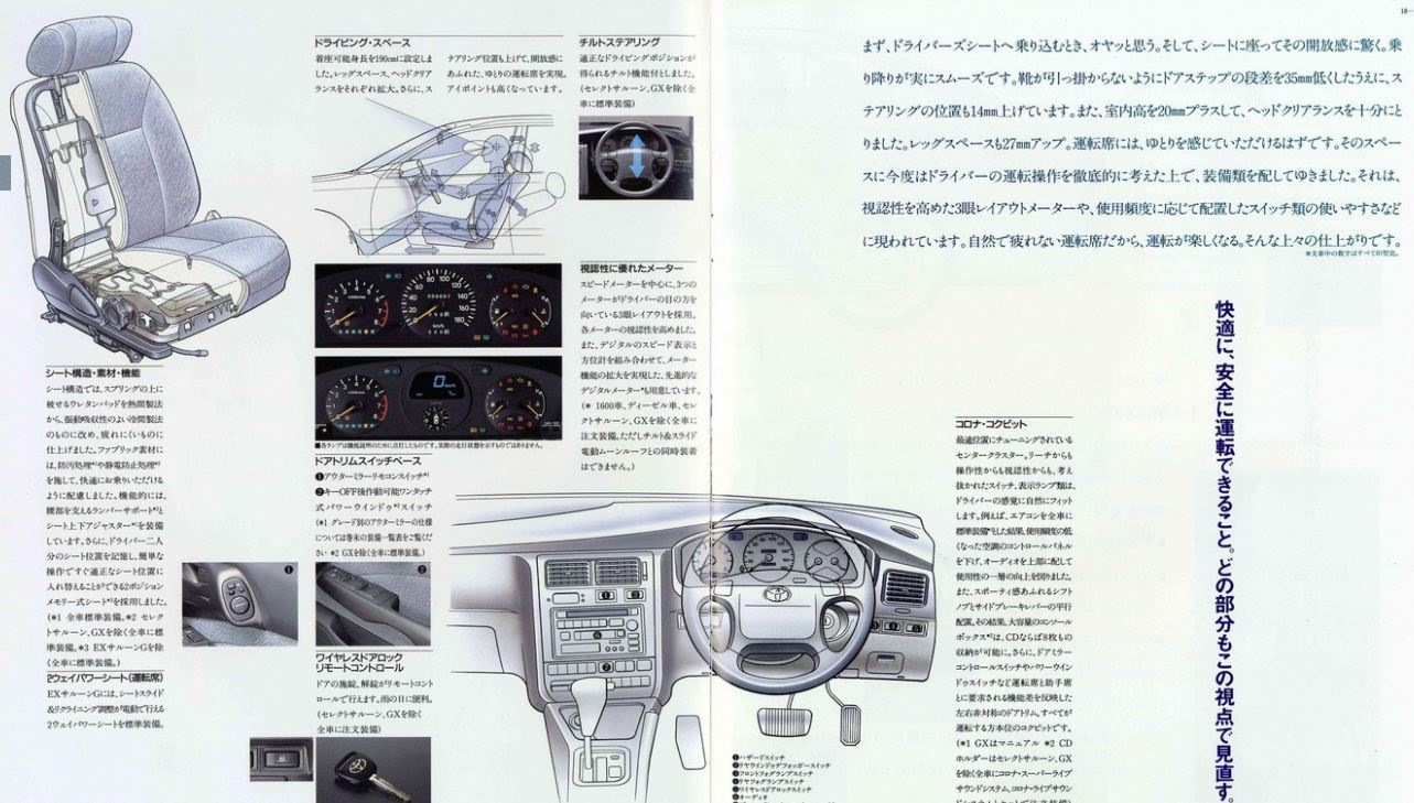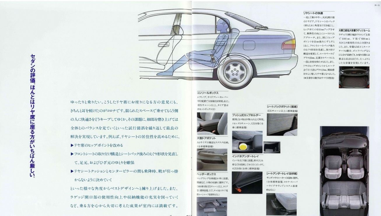 Формула успеха была проста – среднеразмерный седан, который подходил как для обычной семьи до 5 человек, так и для личного пользования, достаточно неприхотливый в обслуживании ввиду простой и надёжной конструкции и практически неубиваемым движком первого поколения (A или S серии) объемом 1,6, 1,8 или 2 литра. Золотое сечение автомобиля для жизни на каждый день. Шутка ли – и сейчас встретить в потоке Корону года так 93-го – дело обычное. Машины, конечно, своё повидали, но ехать продолжают. И если в центре их уже мало, то в районах и деревнях – стоят чуть ли не через двор. И ездят.