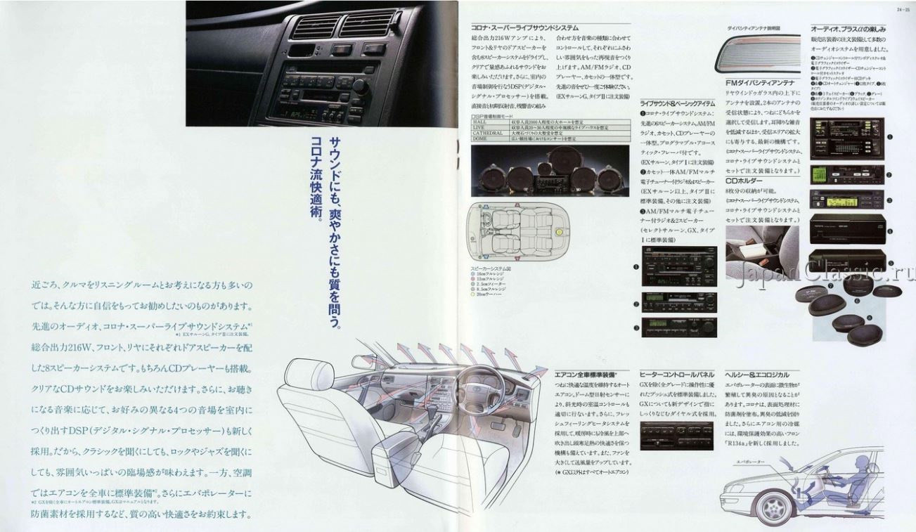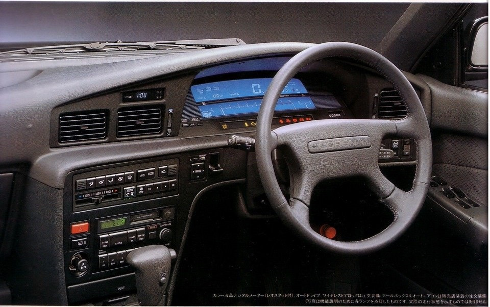 Отдельно стоит сказать про акустическую систему общей мощностью в 216 Вт. В Toyota Corona задумались о том, что для многих машина является в том числе и персональной «комнатой» для прослушивания музыки и подошли к оснащению автомобиля в этом направлении, как бы это сказать, с повышенным вниманием (ну, для этого класса). По заявлению производителя, рок, классика или джаз звучат здесь одинаково приятно (особенно если прослушивать это через встроенный CD-проигрыватель). По воспоминаниям – да, звучало неплохо, хотя мы чаще использовали кассеты, нежели компакты, но и с ними было приятно и… Атмосферно, вот.