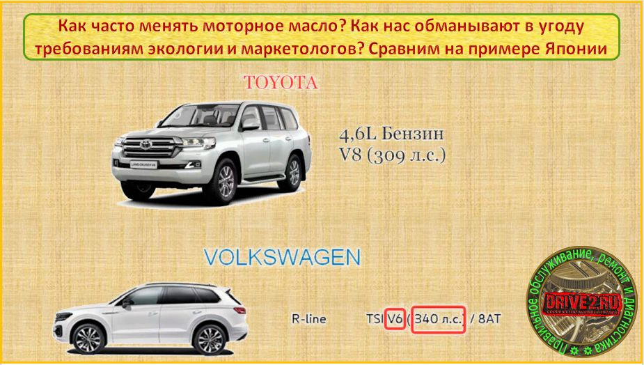 А теперь давайте сравним, как часто рекомендуется замена масла на этих автомобилях. Тойота предписывает делать замену раз в 10 000 км пробега. У Фольксвагена — 15 000 км пробега. То есть при том, что у Фольксвагена объем двигателя меньше на 34,78%, при этом мощность мотора выше на 9,11% замена масла делается реже в полтора раза. То есть при пробеге 30 000 км на Туареге масло будет заменено 2 раза, в то время как на менее мощной Тойоте уже — 3!