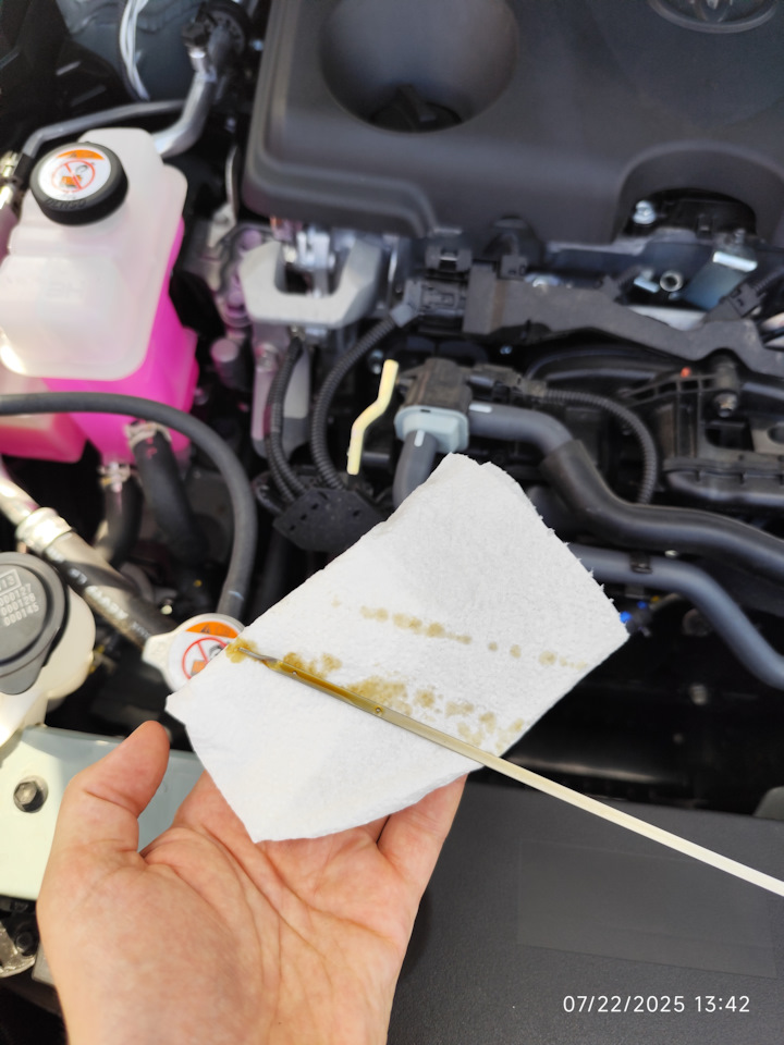 Ну вот я за день перед ТО-1 просто для себя посмотрел уровень и цвет масла — абсолютно нормально выглядит для пробега 15000 км, уровень был в норме.