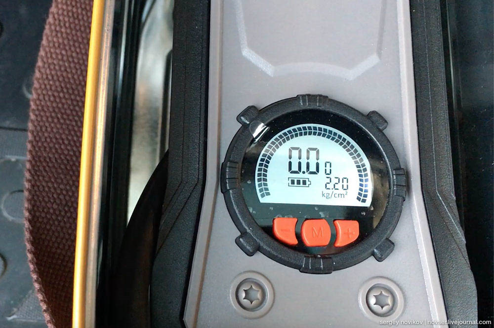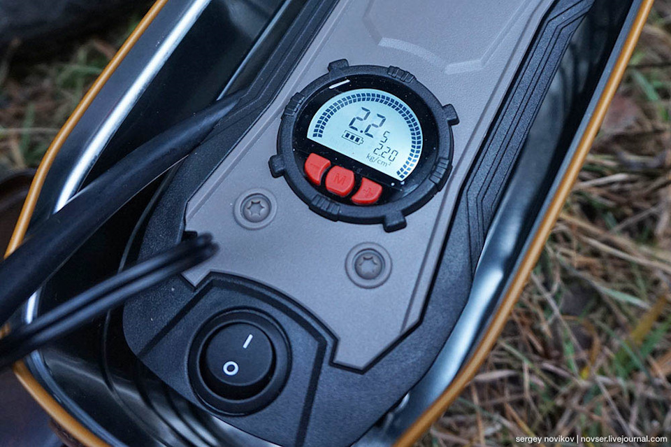 Сразу бросается в глаза, что компрессор BERKUT SPEC-2M отличается от большинства других, наличием цифрового манометра с подсветкой. На мой взгляд, это очень удобное и современное решение. Индикация давления производится в четырёх единицах измерениях: bar-kPa — psi-kg/сm (бар-кПа — фунт/кв.дюйм-кг/cм). Управление производится тремя кнопками расположенными снизу экрана манометра. Здесь же рядом находится и клавиша включения компрессора.