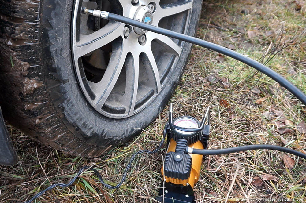 Для тестирования компрессора будем накачивать полностью спущенное колесо размерностью 16 дюймов с резиной 205/50. Хотел сравнить с моим старым компрессором, про который я уже писал года полтора назад, но, он пару раз ломался и после последнего раза я его не стал больше ремонтировать. Сравнивать будем с аналогичным, который я позаимствовал у отца. Его характеристики, внешний вид и даже цвет точно такие же как на моей «Улитке», только название другое.