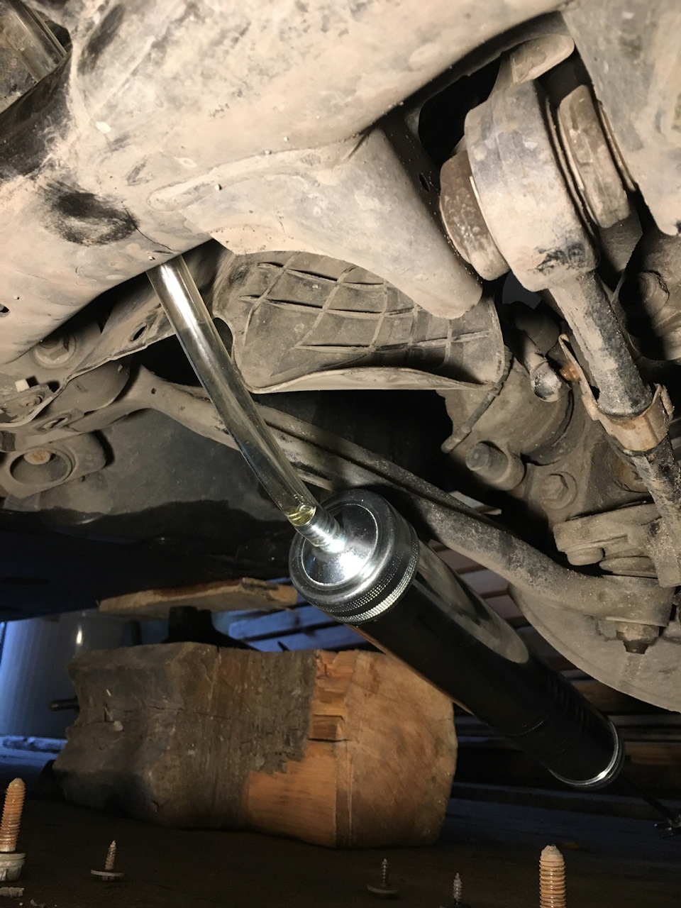 После этого можно легко добраться до пробки раздаточной коробки. Откручиваем ее шестигранником на 14. Вставляем тонкий шланг на дно раздатки, откачиваем масло. Мне откачивали специальным аппаратом, при этом водили шланчиком по дну, чтобы собрать все масло. Получилось около 350 мл. Масло было тёмное ( не зря менял). Далее заливаем новое масло в шприц и закачиваем его пока не польётся. Закручиваем пробку моментом 60 Hm. Ставим на место кронштейн и соединяем его с раздаткой. Потом устанавливаем защиту и готово. Адаптацию раздаточной коробки сбрасывать не стали.