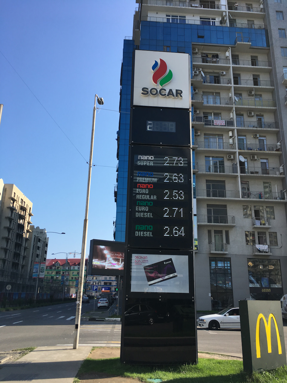 Машин на дорогах очень мало. Видимо потому, что топливо дорогое. Газ 33-41р, бензин — 70-90р. На разных заправках разброс цен очень большой. Но заправок много, и на 90% из них есть газ. Обозначается LPG.