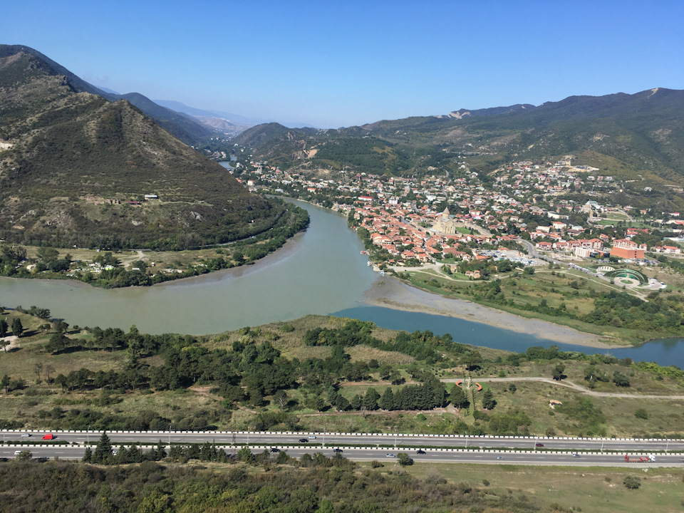 По пути, заехали в Мцхету — старую столицу Грузии, поднялись к древнему монастырю Джвари. Отсюда классный вид на слияние Куры и Арагви, который есть на всех фото Грузии. Не удержались и мы. :)