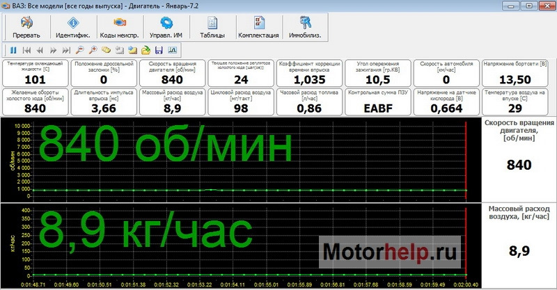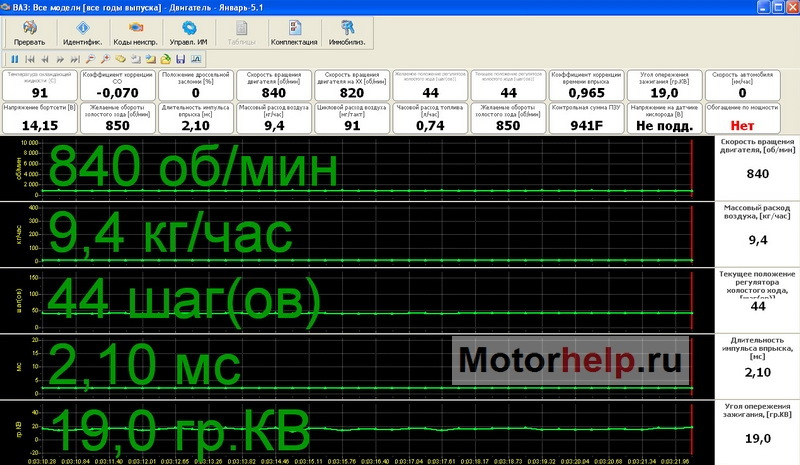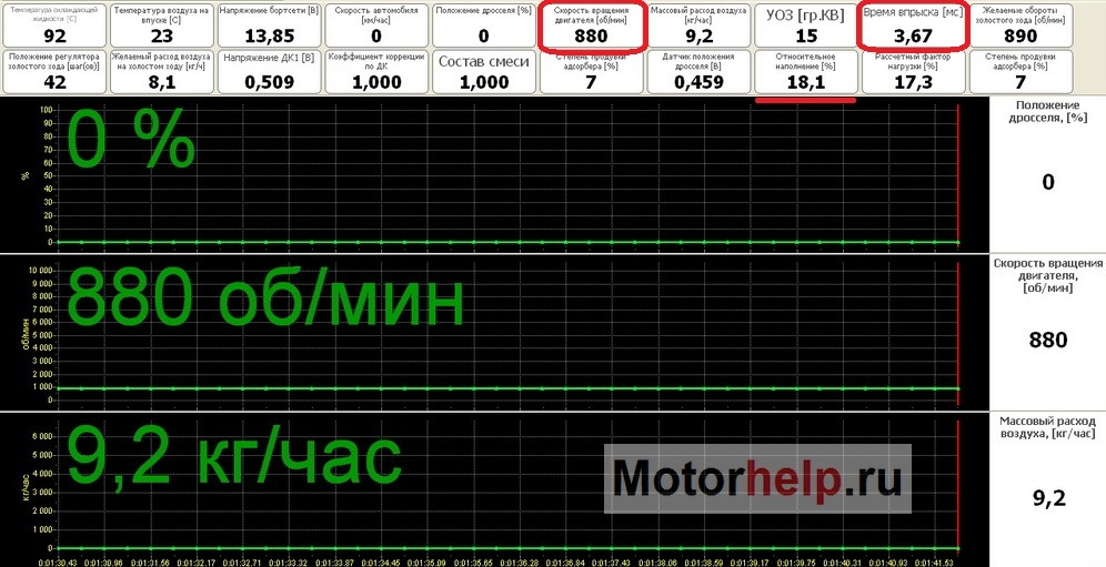 2.1 Обороты холостого хода. Обычно это – 800 – 850 об/мин при полностью прогретом двигателе. Значение количества оборотов на холостом ходу зависят от температуры двигателя и задаются в программе управления двигателем.