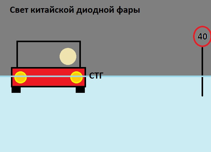 Мы видим что китайская фара не досвечивает огромный участок на своей полосе и правой обочине…