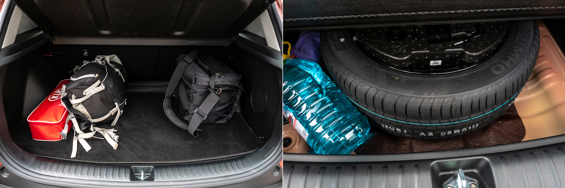 Невысокий (под жесткой полкой) багажник 433 л — с полноразмерной запаской под поликом. Под колесом есть некоторое количество шумки, в отсек можно сложить много всего — тот случай, когда я выбрал бы вариант с плоской докаткой для увеличение объема перевозимой поклажи. Спинки задних кресел складываются почти в ровный пол. Доводчиков и открытия взмахом ноги нет даже в топе.