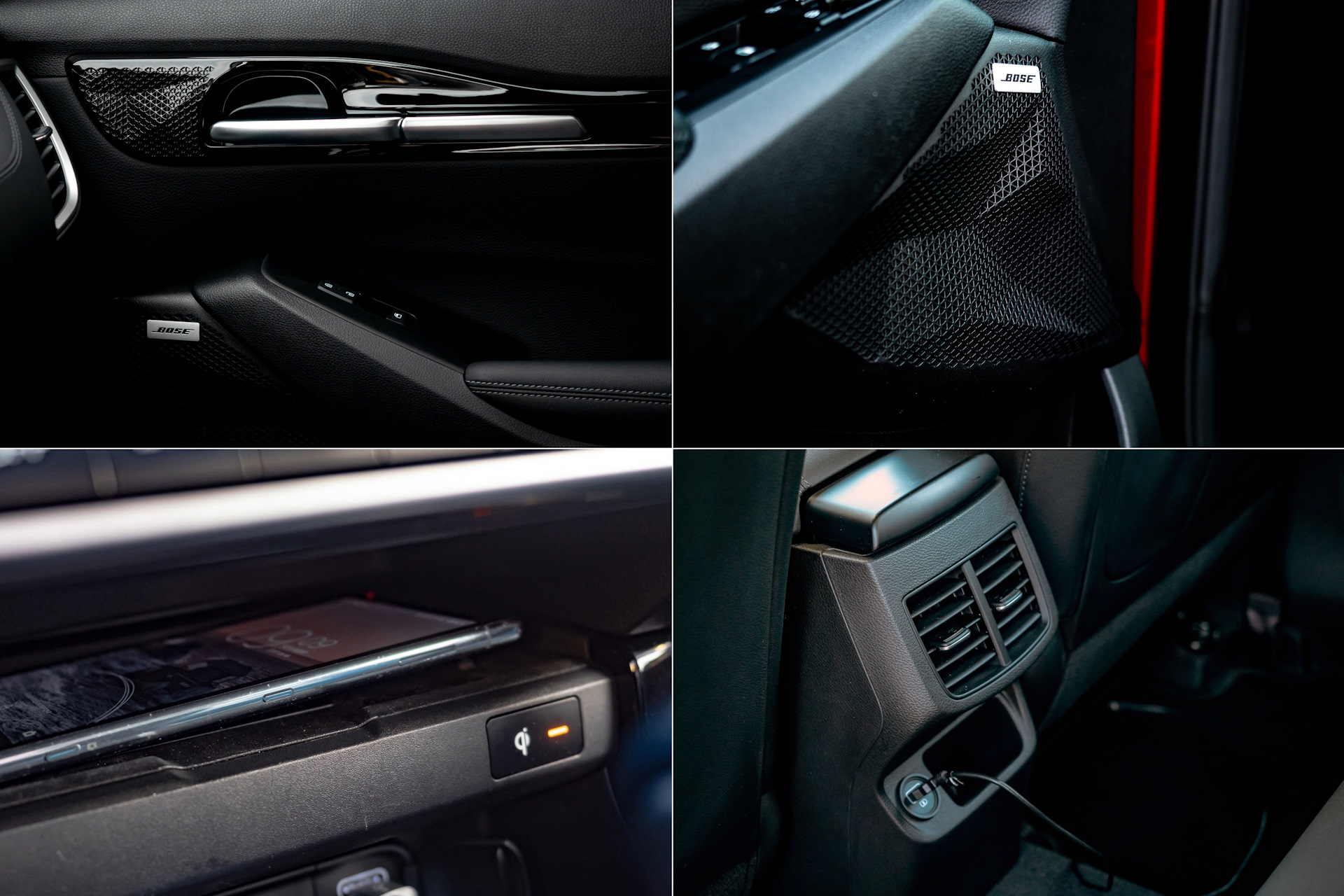 Пластик на дверных картах спереди мягкий только над подлокотником, сзади жесткий везде. Решетки динамиков Bose выглядят необычно — как покрашенные в черный кристаллы льда. Автоматический стеклоподъемник лишь у водителя, зато на правой двери есть клавиша центрального замка.