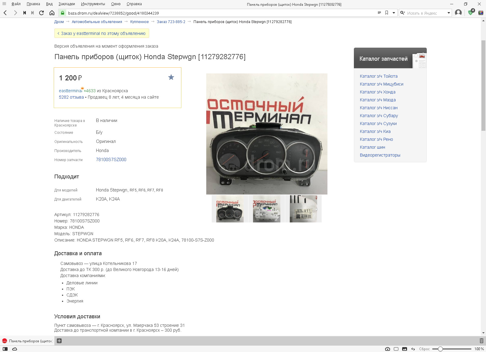 20.10.2019 приспичило мне купить донорский щиток приборов, т.к. от цивика он стоит безумных денег, решил купить от stepwgn. На baza.drom.ru у продавца eastterminal нашел щиток и заказал дополнительно оплатив доставку до транспортной компании Сделка была "защищена" drom.ru.