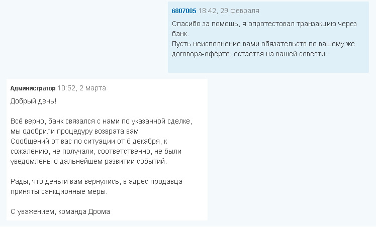 Я скорее всего не прекращу пользоваться услугами drom.ru(им нет альтернатив на рынке деталей для рисовозок) и продавца(у него самые дешевые цены на drom.ru), но теперь понимаю что попытки решать что-то с ними — бесперспективное занятие. И да, плюсы защищенной сделки в том что диспут можно открыть, т.к. транзакция идет через платежную систему.