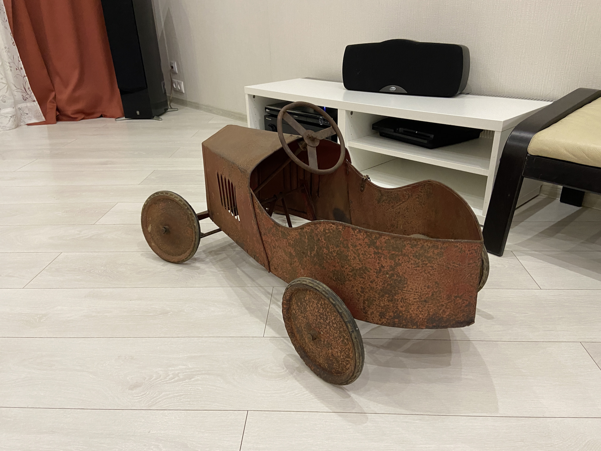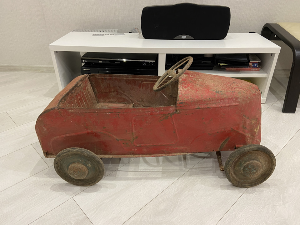 Французский педальный автомобиль марки Kid, производства компании из г. Лион. Модель 124, год выпуска — 1931 год! Родная краска, родные колеса и только поверхностная ржавчина. За 90 лет не подвергалась никакому воздействию!