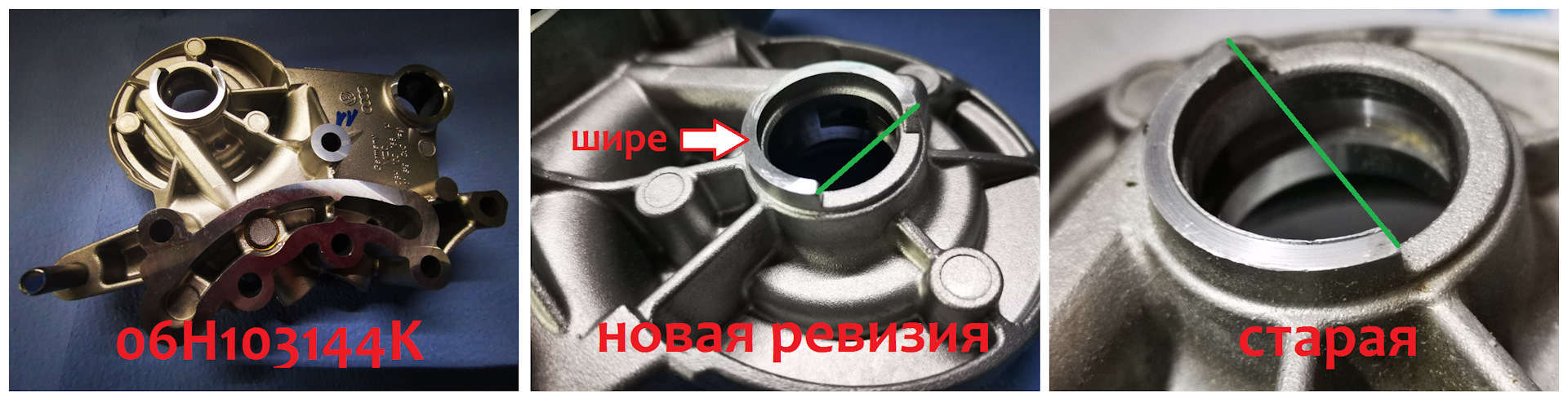 Износ опорной перемычки явление не особо частое, зависит от качества применяемого моторного масла. Если вы увидите заметную выработку перемычки опору нужно заменить на новый образец 06H103144K с более длинным отливом.