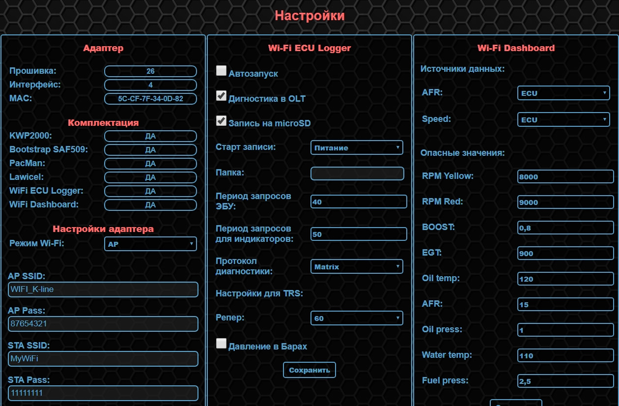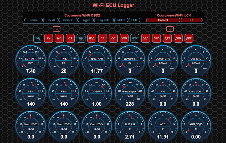 Настройка ПАК "Матрица" в режиме Онлайн довольно давно работает на адаптере WiFi-OBD2, а вот в логгере WiFi ECU logger диагностический протокол реализован не был. По просьбам пользователей данный недостаток устранён и теперь обладателям прошивок j5ls, j7ls можно пользоваться в полном объёме функционалом: