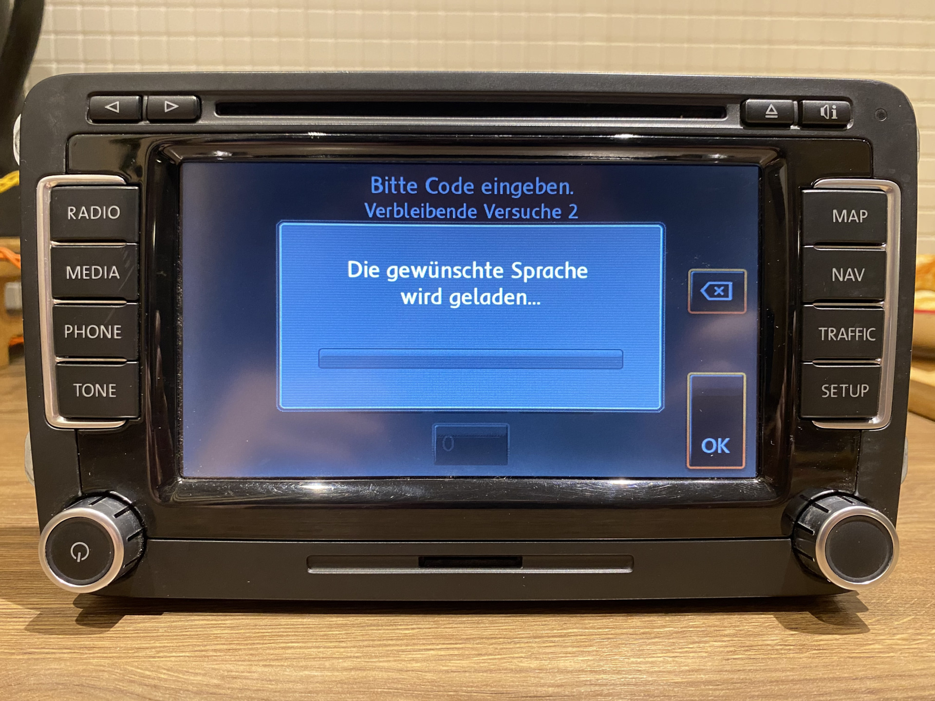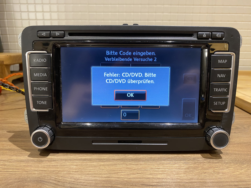 Даавненько не писал в блог — не было настроения. Но жизнь продолжается — и ремонты автомобильного железа таки бывают. Сегодня про ШГУ (штатное головное устройство) серии RNS510/Коламбус после посадки АКБ (долгой стоянки машины). Заказчик обратился с проблемой отсутствия звука и воспроизведения чего либо, немецким языком и работающей навигацией. Попытка переключения языка в меню приводила к зависанию ШГУ вот на таком экране: