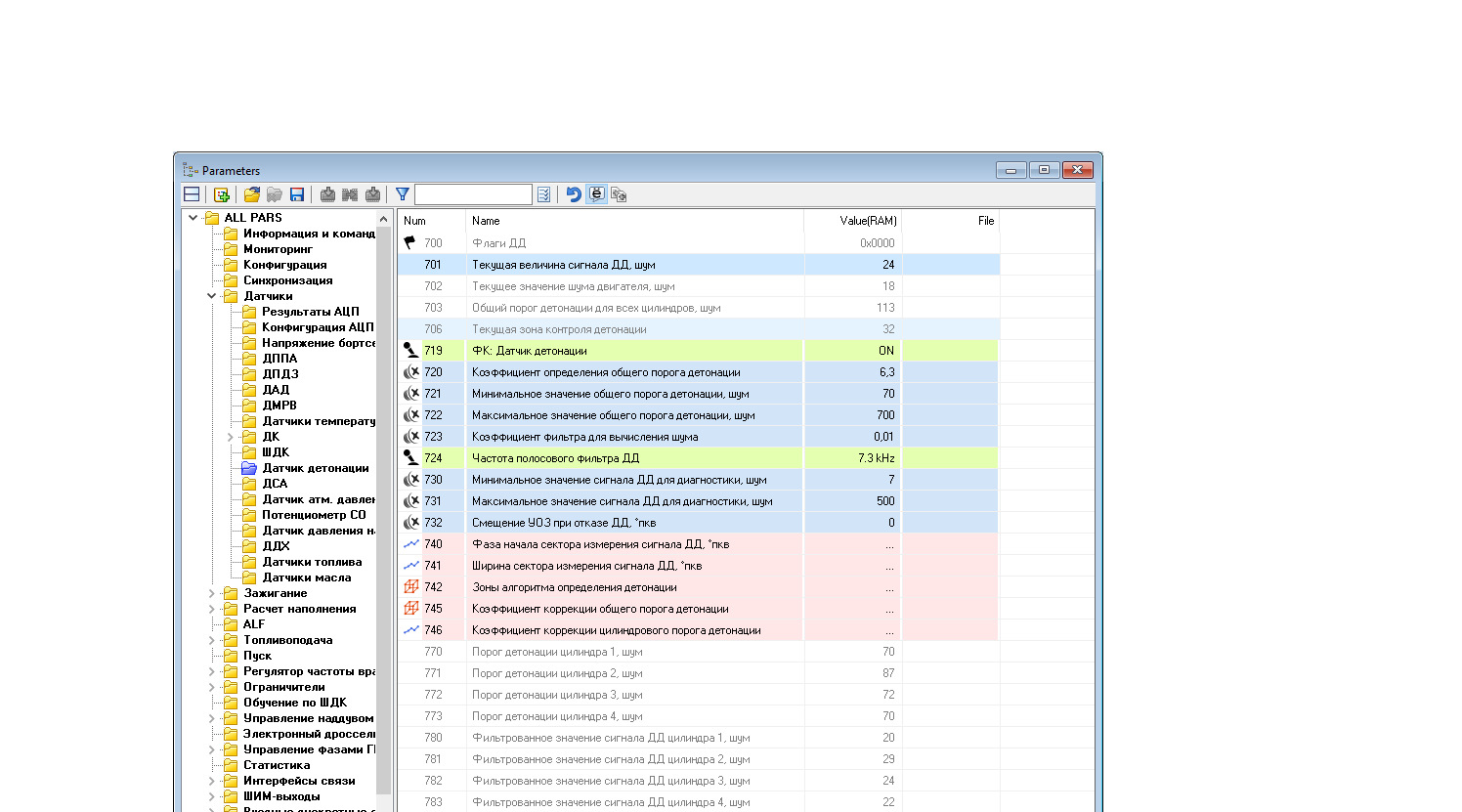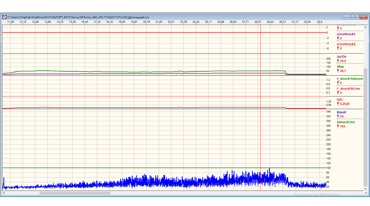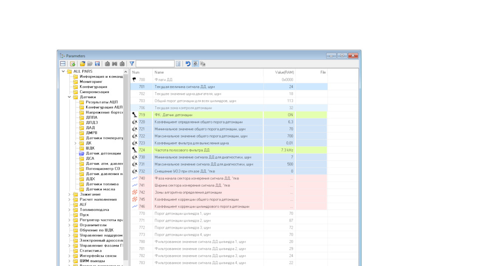 Теперь наша задача подогнать "703 Общий порог детонации для всех цилиндров" под это значение. Сейчас в логе мы видим что параметр 701 упирается в 100. Это "721 Минимальное значение общего порога детонации". Необходим для работы в период когда после пуска двигателя параметр "702 Текущее значение шума двигателя" еще не прошел через зону 48 и не определен.