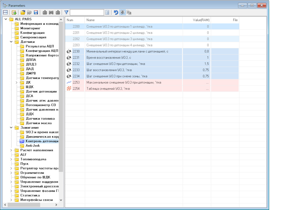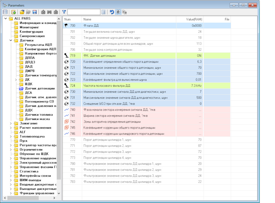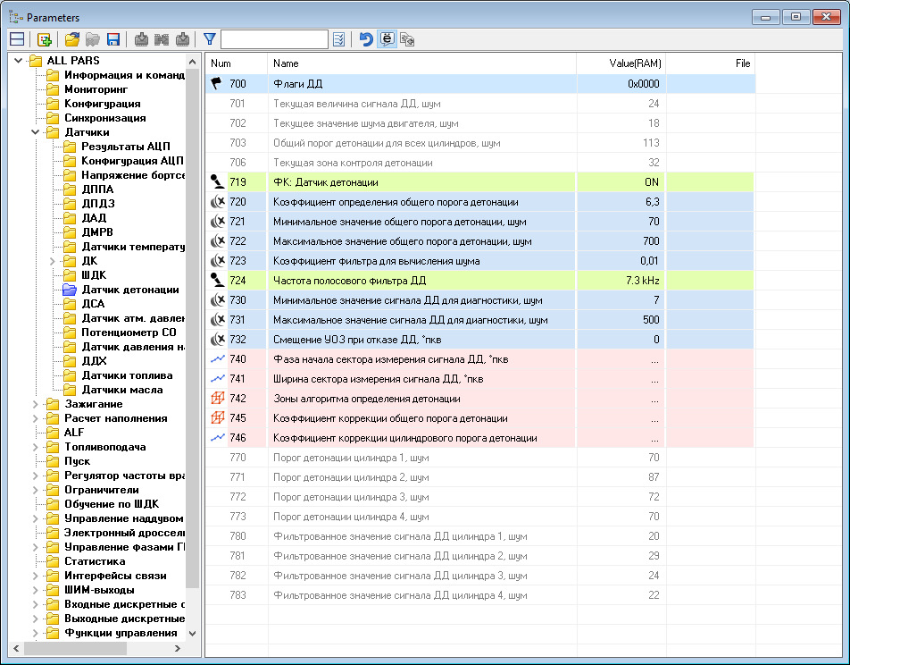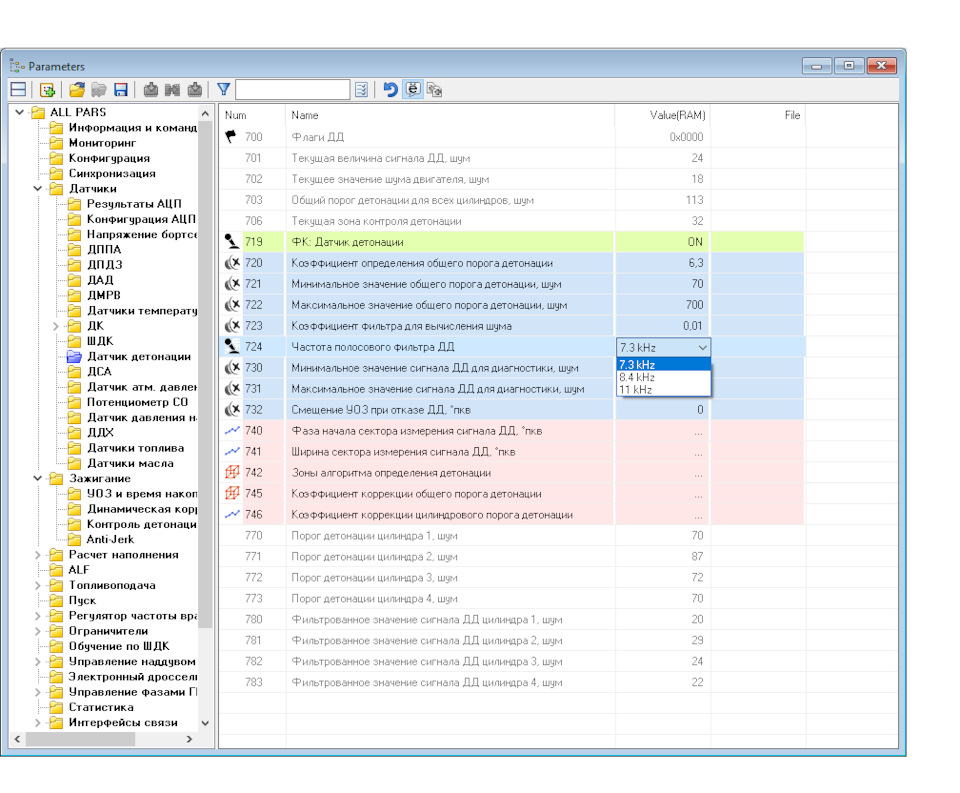 В первой вкладке "Датчик детонации" куча параметров и самое ужасное — почти все нам нужны.