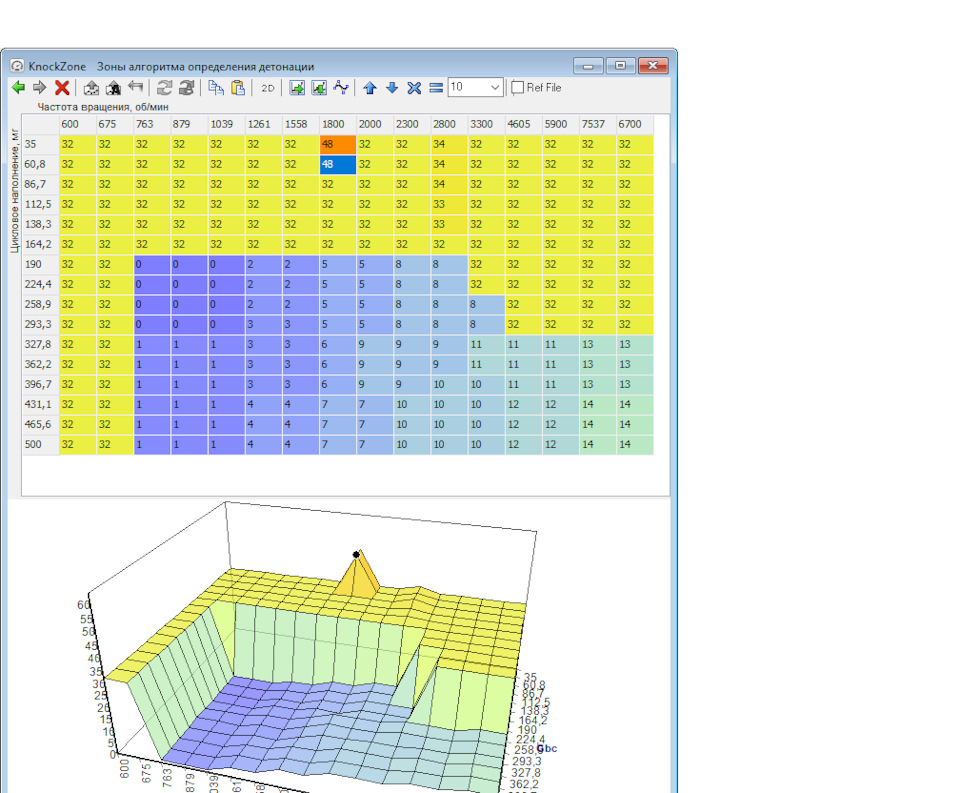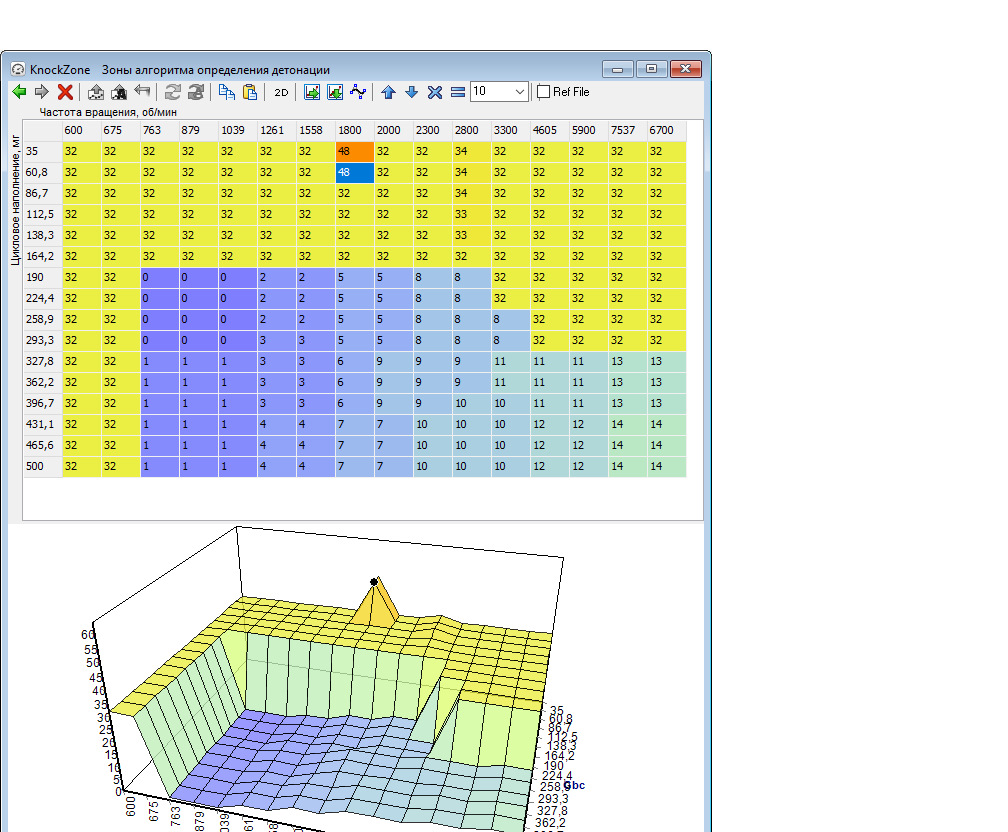 Ладно. Сначала сделаем зоны алгоритма определения детонации. Не буду подробно рассказывать что это и как работает, вроде как это совсем не сложно и в "Справке" данный вопрос хорошо описан. Скажу только, что зон 16 (от 0 до 15) которые вы можите распределить как вам угодно в зависимости от нагрузки и оборотов (да, в новой версии в данной таблице ось нагрузки можно выбирать (Наполнение, Давление или дроссель)). Как их правильно распределить тоже вопрос и каждый сделает это по своему, но суть ясна. Еще две зоны: