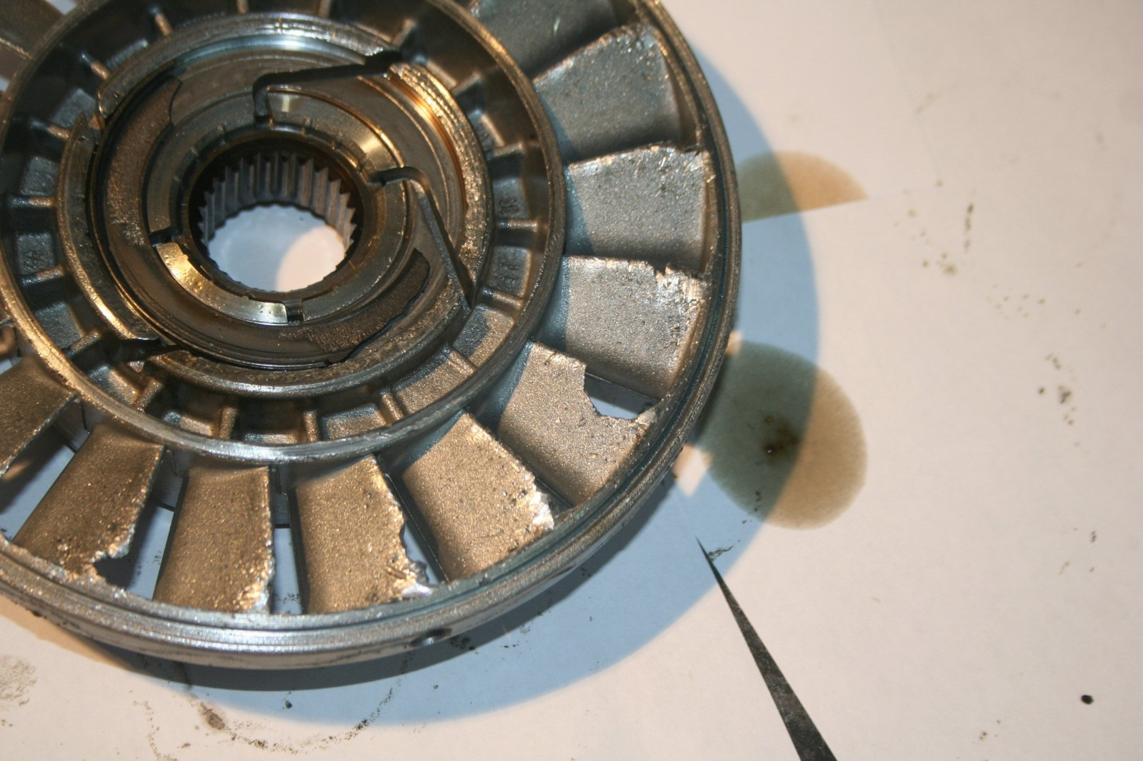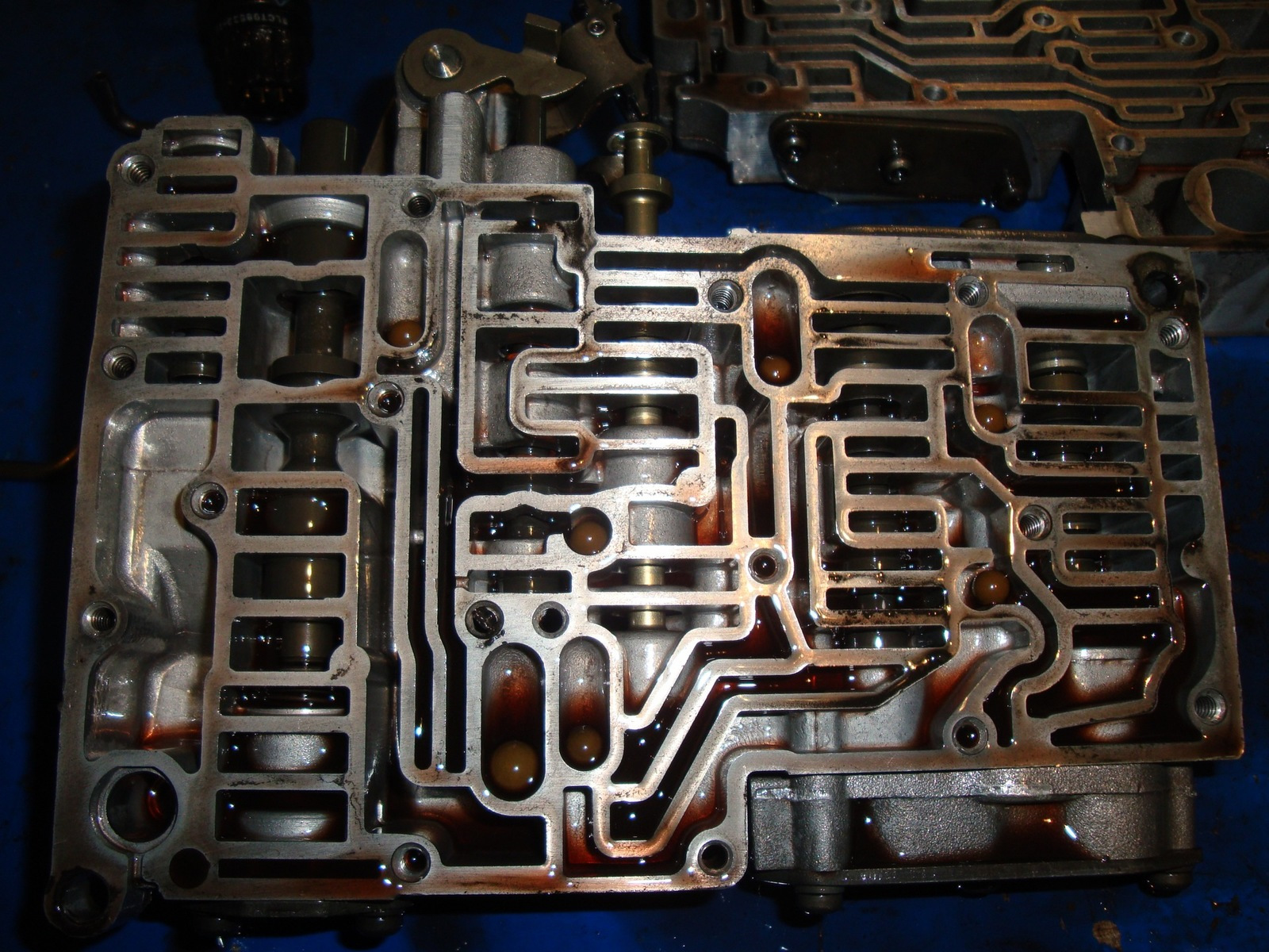 Обугленные фрикционные накладки не впитывают достаточно масла для охлаждения и начинают разрушаться, тем более, что подгоревшее масло уже не выполняет свои функции полностью. Разрушенные части фрикционов и их клеевая основа разносятся по узким каналам АКПП, забивая их, что опять же снижает проходимость каналов для трансмиссионного масла и еще больше усугубляет проблему.