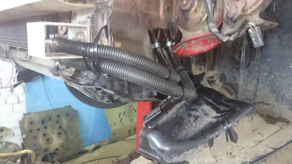 В общем, за вечерок у себя на сервисе все собрал. Ничего нигде не сверлил, исползовал штатные технологические отверстия. Заранее заготовил уголочки из нержи, шланги Gates, качественные хомуты, подходящий крепеж и гофру, в которую упаковал шланги.