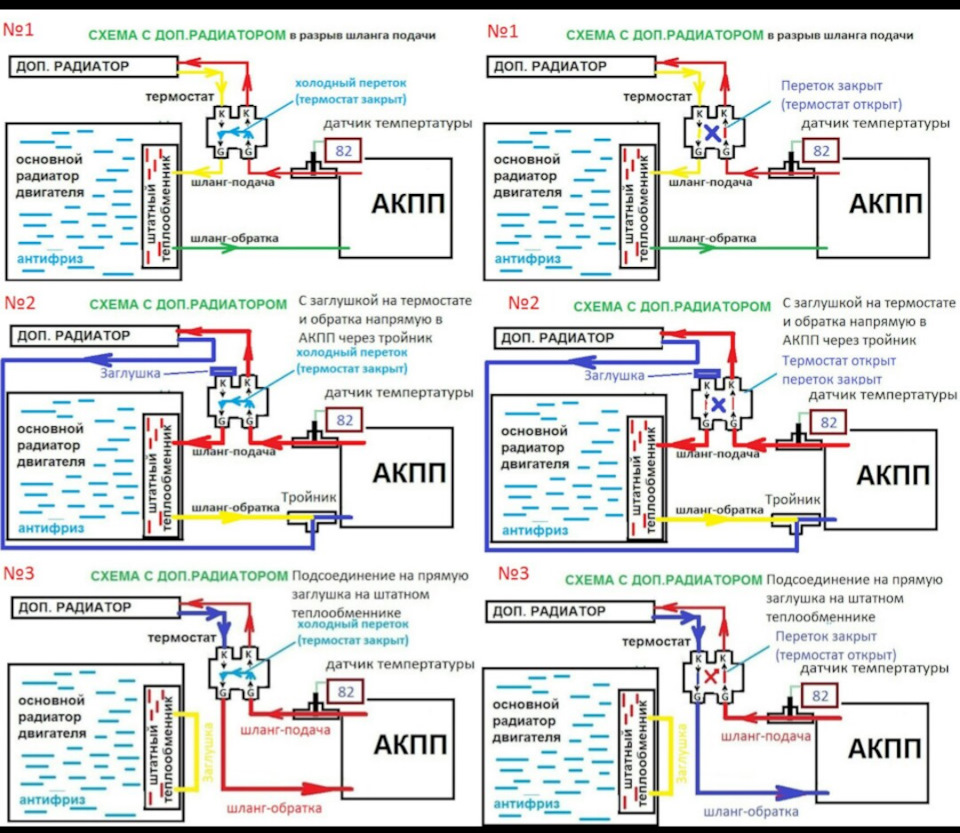 Почему исключил основной основной — логика проста — нормальная рабочая температура масла акпп 85 градусов, а что происходит с маслом в пробках и отжигах, после прохождения основного радиатора? — Все верно — оно держится в районе общей температуры антифриза, т.е. 95-98 градусов. Да, конечно, свою конструкцию буду исрользовать пока на лето, а вот ближе к зиме поставью масляный термостат и переподсоединю по одной из схемок ниже.