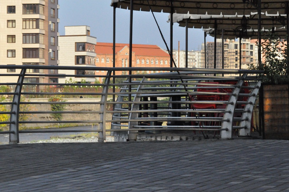 В исторической части часто попадается такая кладка — сочетание булыжника и кирпича, потом мы такую много будем встречать в Грузии. Набережная выглядит несколько заброшенной, хотя если внимательно разобраться — такое впечатление создается из-за нескольких недостроев напротив и не очень аккуратного ограждения. На той стороне, где заброшенная стройка, никакой пешеходной набережной нет. А с нашей стороны была хорошая тенистая аллея и несколько кафе.