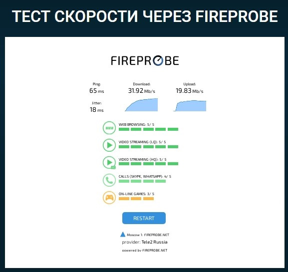 Очень близко к первым результатам: оставим его и будем верить, что скорость за 30 Мбит/с мы имеем. Но надо еще один! Находим в сети сервис тестирования скорости интернета под именем FIREPROBE: